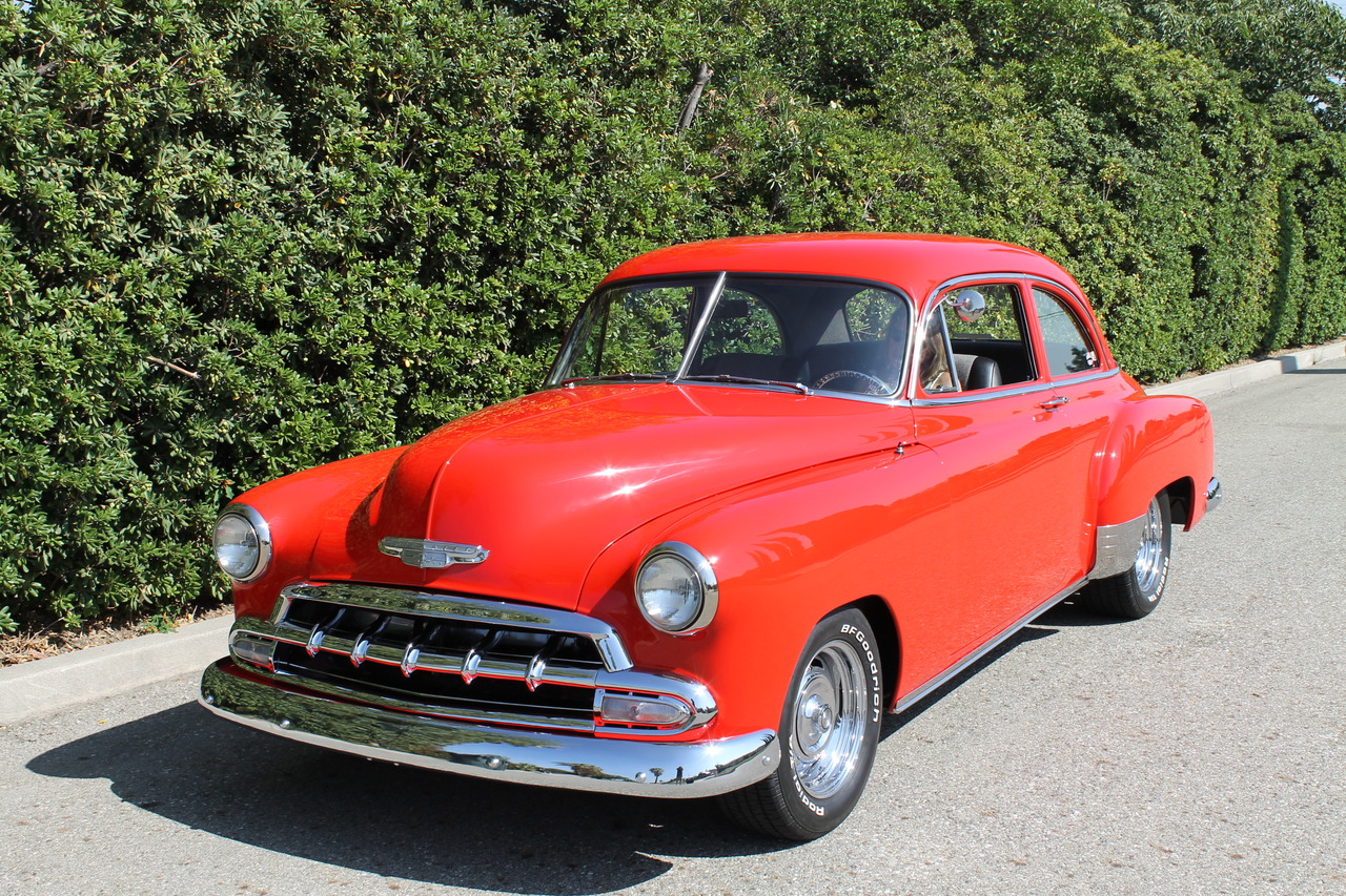My wife's ride: A 1952 Chevy Styleline Deluxe, 1968 Camero Chrome Ralley wheels with T/A Radials, PPG #D752 Red paint under clear coat.