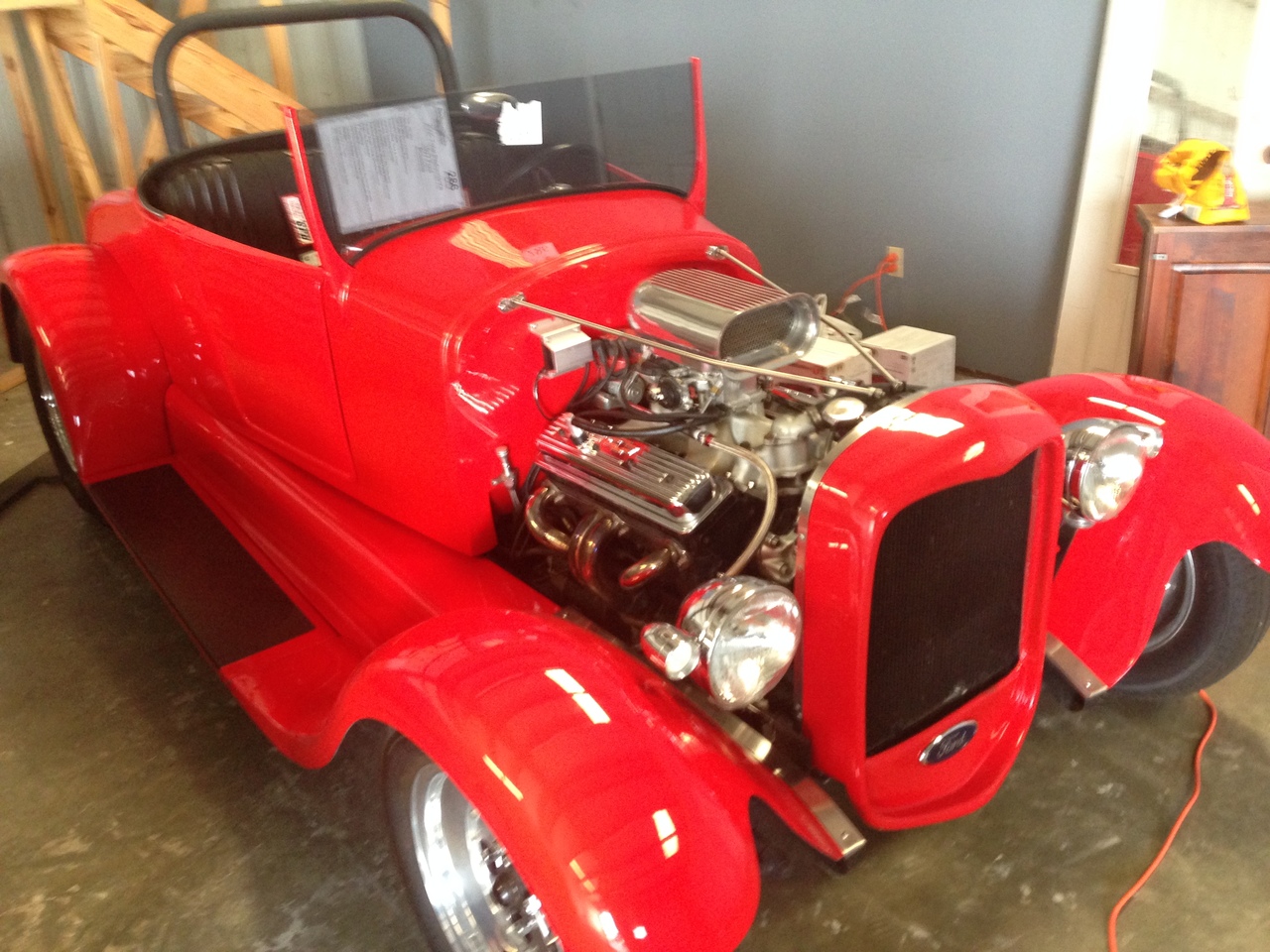 Fabulous 'glass red '27 Ford roadster street rod-GM 350 V7-350 Turbo automatic transmission-custom frame-Flaming River rack & Pinion, Ididit tilt steering wheel, new Summit 650 c.f.m., chrome alternator/water pump/fuel pump, dual line 4 barrel carburetor, 9" Ford rear end, racing style seat belts,