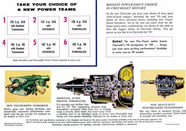 The 1955 Chevy had a variety of options to choose from including 6 different Power-Drive Combinations, 2 Valve-in-head engines, and the choice of 3 advanced drives such as:
