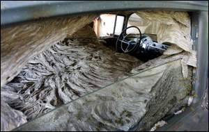 There's only one way to get rid of those bees and their hive. As much as I would hate to do it,the only way to evict the bees is to pump 30 gallons or so of gas into the car, and set it on fire. That's the only way. Real shame to loose any salvagable stuff.
