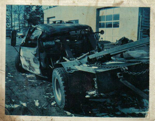 72 dodge was pulling econoline when chains broke sending it into abridge abutment.