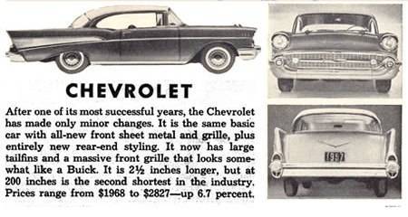 One of the most successful and popular years for the Chevrolet Bel Air Series. With only a few changes from previous years, the new Chevrolet now has large tailfins and is 2 1/2 inches longer. In 1957, prices ranged from $1968.00 to $2827.00