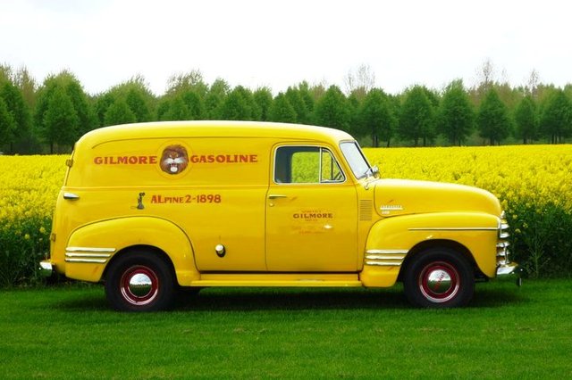 This is a 1951 Chevy 'Gilmore Gasoline' Panel, since 2010 in the Netherlands.