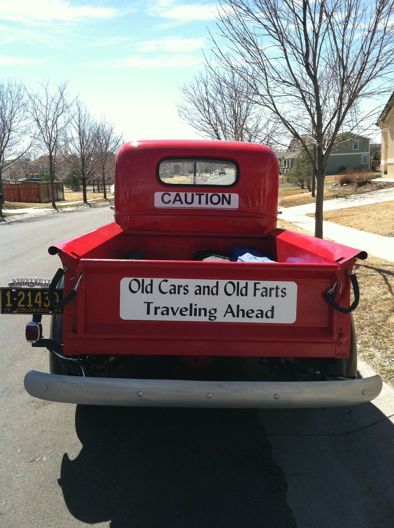 Sharing the signs our local car club uses while on tours and cruises to get traffic to slow down. 1946 Chevrolet truck owned by our youngest member in Brighton, CO