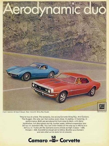 Both aerodynamic from nose to deck with full door-glass styling, bucket seats, refined suspension and 327-cu-in. standard V8s. The Chevrolet Corvette Sting Ray Coupe and the Camaro SS Sport Coupe were quite a pair!