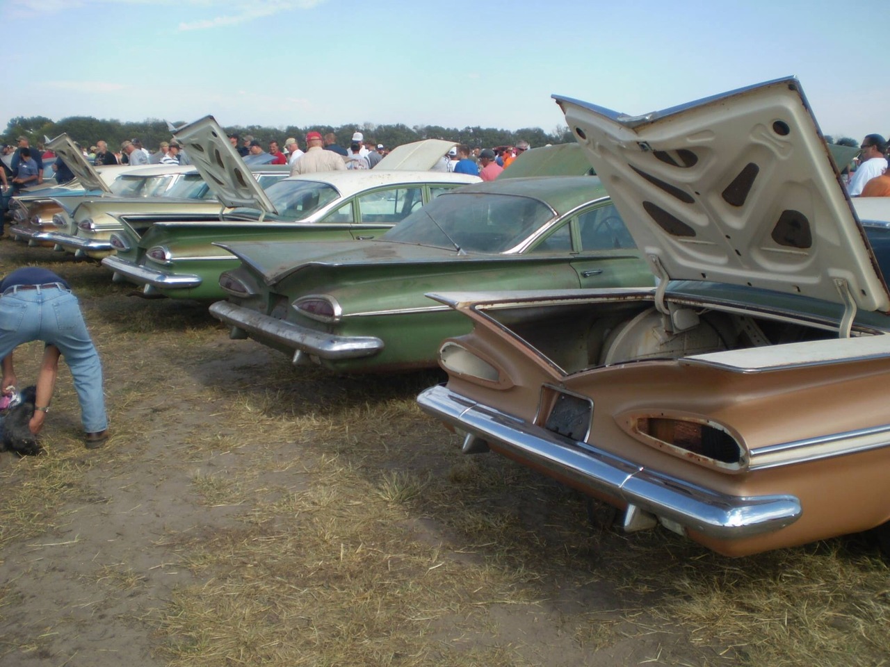 1959 Chevys all lined up. Most of these cars were NOS, never driven and stored inside. They all had less than 5 miles on the odometer.
