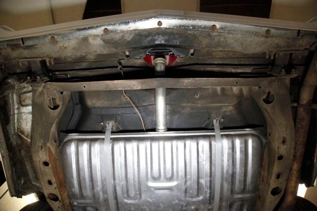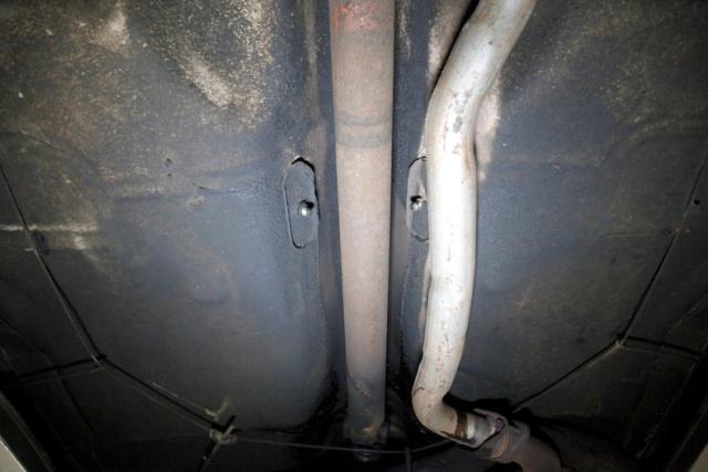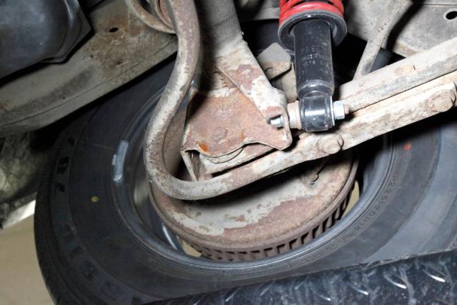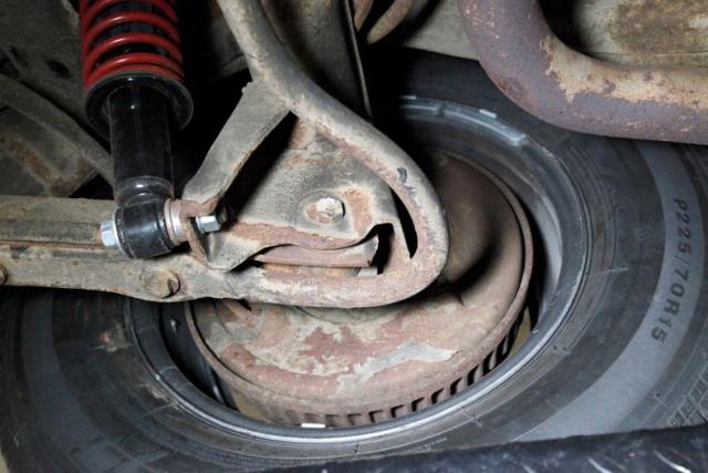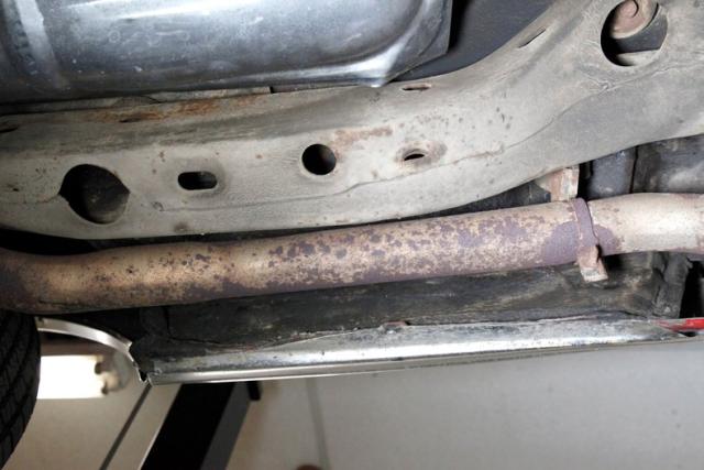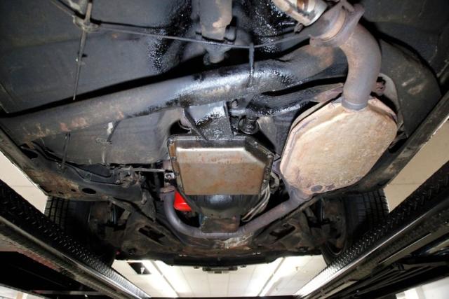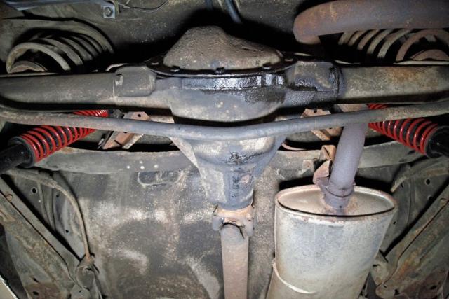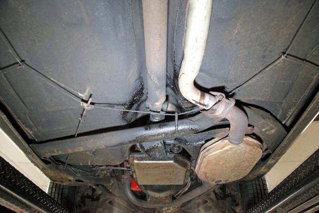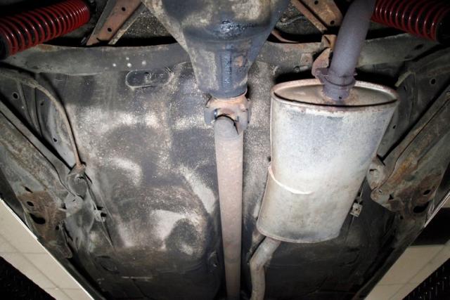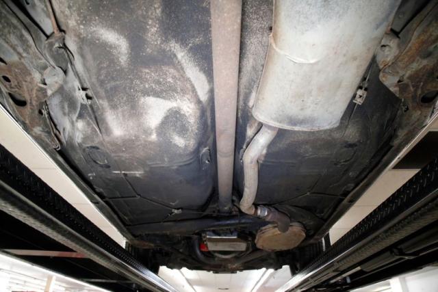 Up on the lift we can see the meat of the operation from underside, we note power steering, power front disc brakes along with power drums on the rear. Single exhaust with a stock replacement muffler along with the usual suspects having some surface rust. The frame is sturdy, as are rockers and floor pans. Independent suspension with coil springs provide the ride in front, and 4 link with coil springs have the rear covered.
