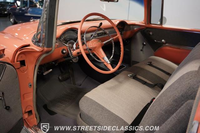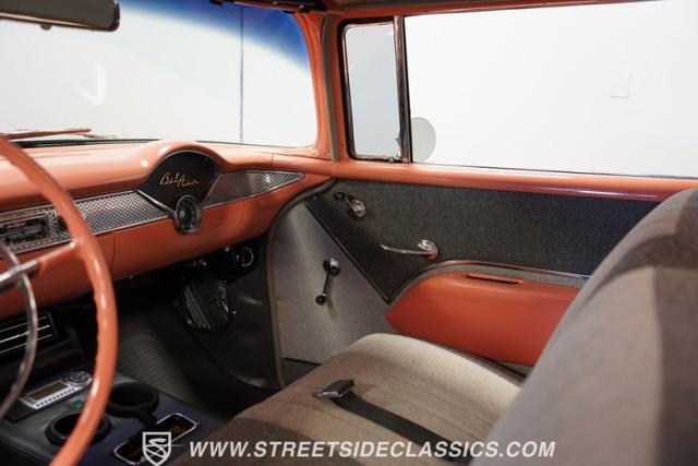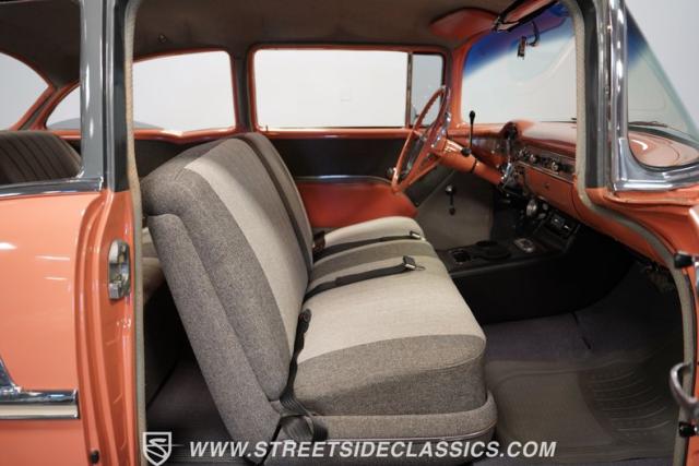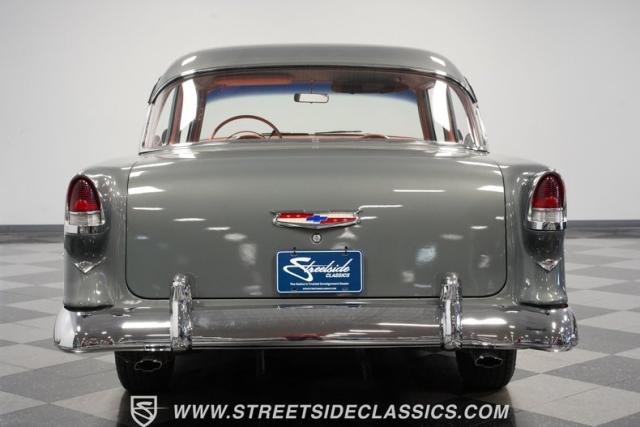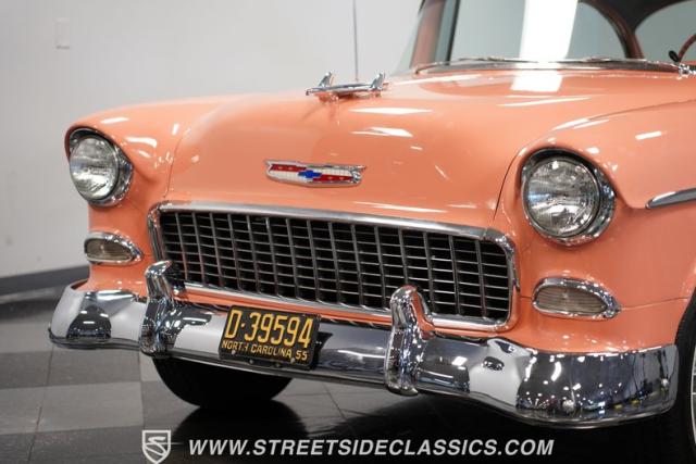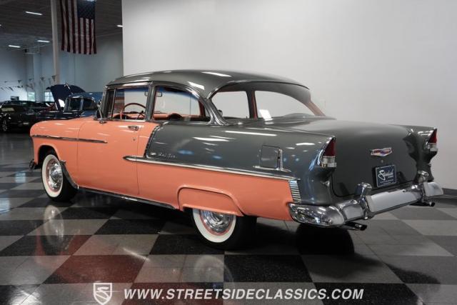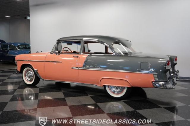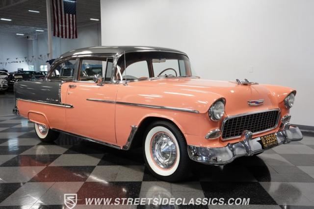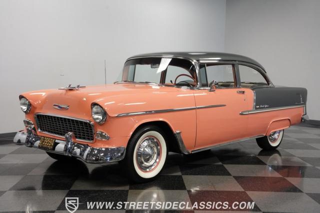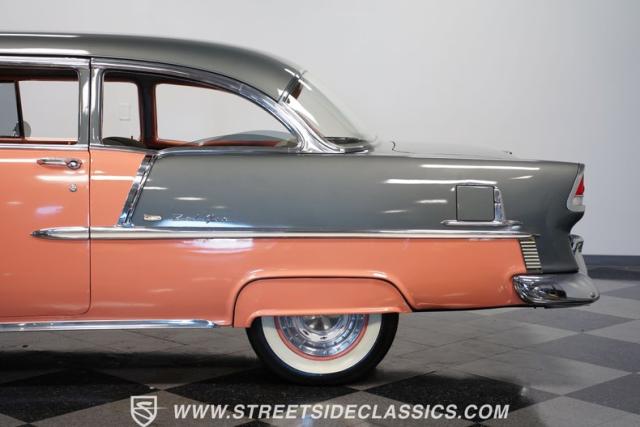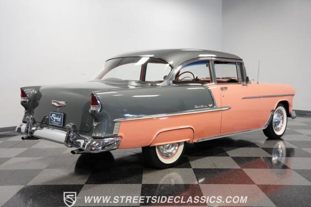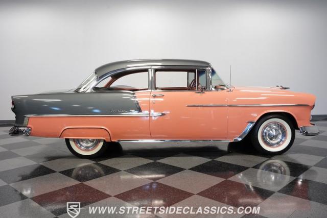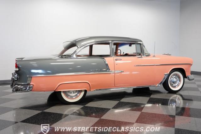 The 1955 Chevrolet was one of the most popular cars of the 1950s when it was new and is equally as popular today. One look at this beautiful 1955 Chevrolet Bel Air two-door sedan, and it is easy to see why. Finished attractively in two-toned factory colors Coral and Shadow Gray, this Bel Air has been tastefully upgraded in just the right places. With its glossy paint finish, accessory fender skirts, bow-tie-shaped chrome dual exhaust tips, and wide whitewall radial tires, this top-of-the-line trim level Bel Air is a whole of 1950s flair and character.