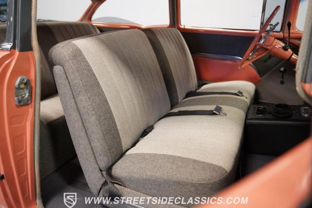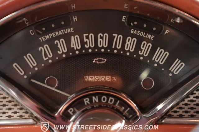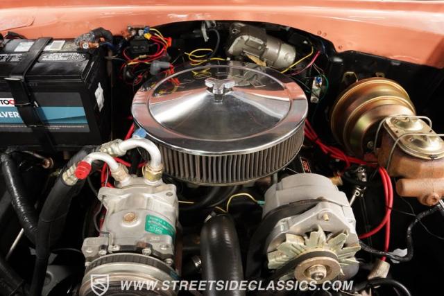 Under the hood, the original 265 cubic inch engine and 2-speed Powerglide transmission have been upgraded to a smooth-running 350 cubic inch GM crate engine paired with a 4-speed 700R4 transmission. Other under-hood upgrades include a 4-barrel intake manifold topped with an Edelbrock carburetor and chrome open-element air cleaner, pusher electric and mechanical fans, and headers exiting through a glass-pack style equipped dual exhaust system producing a throaty and nostalgic sound.
