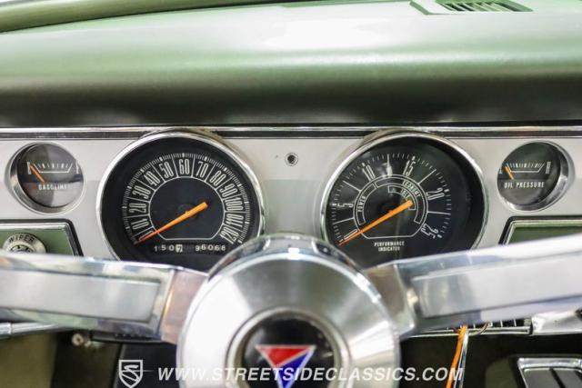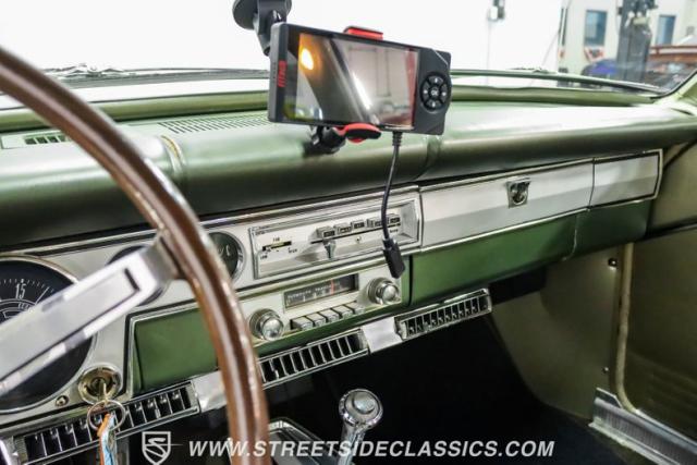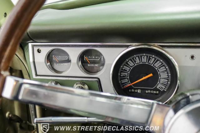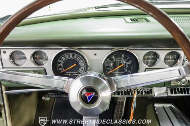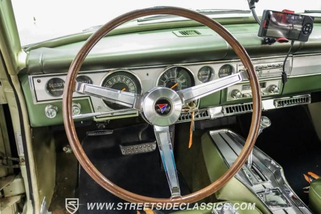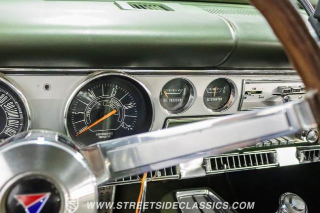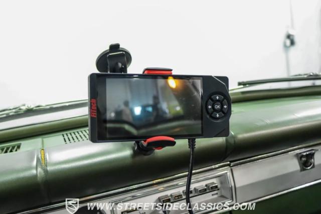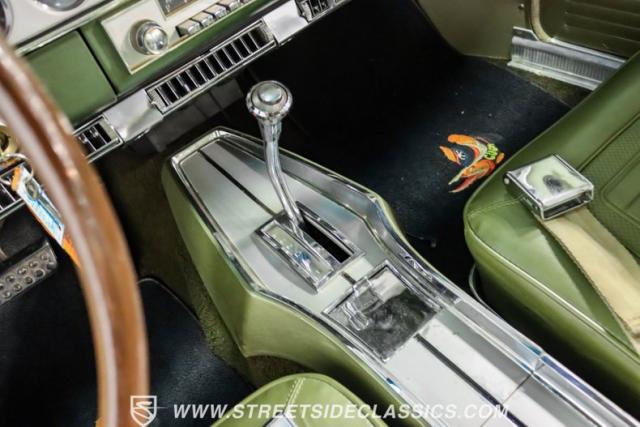 Green vinyl adorns the interior, maintaining the car\'s period-correct atmosphere. Bucket seats flank a center console, emphasizing the Barracuda\'s sporting intentions. The dash houses a woodgrain-style steering wheel, adding a touch of class to the cockpit. Factory air conditioning, updated to modern R134a, keeps the cabin cool during summer cruises. A modern EFI controller and monitor blend seamlessly with the classic instrumentation, offering improved engine management without compromising the vintage aesthetics.