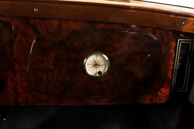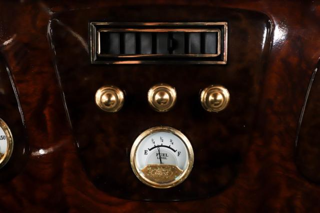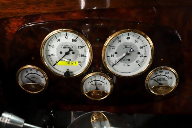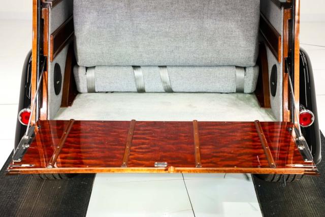EXTERIOR: Rare walnut body with Kewazingo inserts. The woodwork is solid and has a beautiful glossy finish. The doors use piano hinges for a solid and square fit, they shut like a regular car. The black painted surfaces are laser straight and have a mirror reflection. The padded top is finished in a rich black cloth. The glass is all smoked, the doors even have power windows! I love the big original style headlamps with Ford script lenses, the front turn signals are inconspicuously mounted under the fenders. In back it is using original style taillights along with flush mounted LED brake lights in the body. Those aren\'t the only flush mounted lights, there are some under the doors that light up when you open the doors with the hidden levers. How about the 4 individual side pipes showing under each fender! It is rolling proud and pretty on the Boyd\'s wheels: 17s in front, 18s in back and they are wearing Pirelli P Zero tires.
