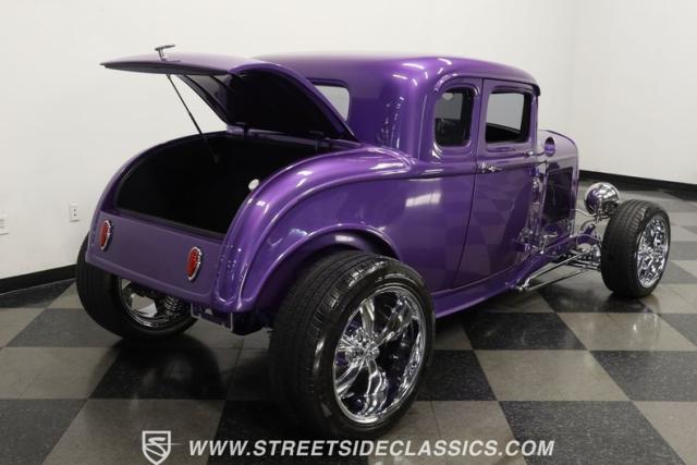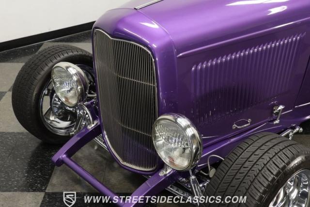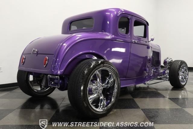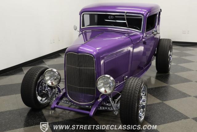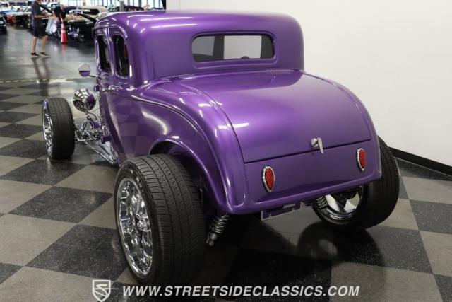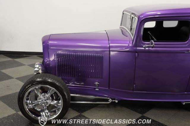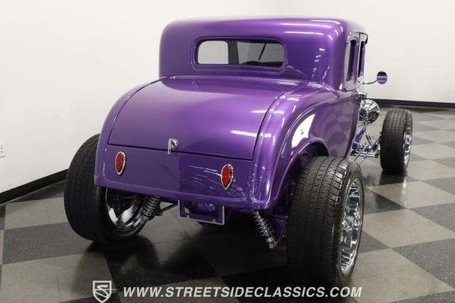 This is one outstanding-looking 1932 Ford 5-Window Coupe BeBops Glassworks body street rod. The purple color alone screams Look At Me. Add that in with stunning chromed-out Ridler wheels, the visible chrome frame supports, the flush chrome grille, and shiny headlight bezels, and this vehicle becomes a legend at car shows and cruises. The undercarriage looks amazing done up in purple and chrome-so super clean as if no one has ever driven it. The rear end shows more purple and chrome visible underbody suspension parts, and the body itself finishes out in the rear, smooth and elegantly.