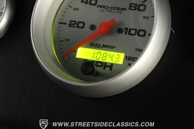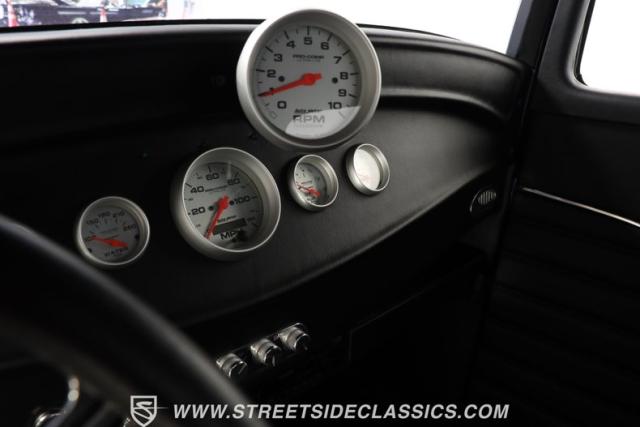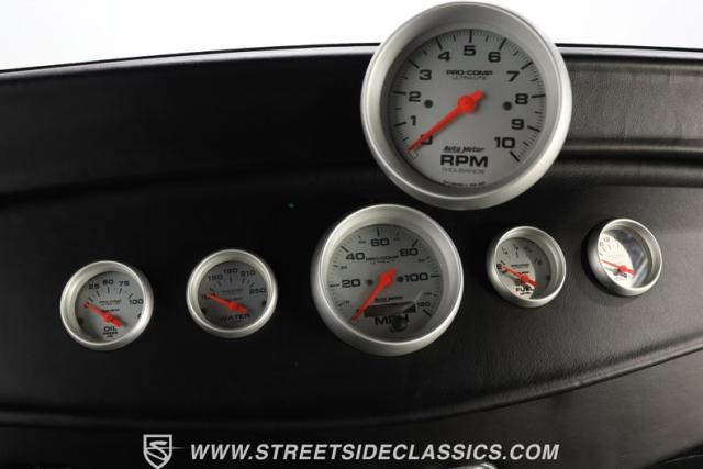 Up front, the suspension features Pete & Jake shocks, while the rear uses QA1 double-adjustable coil-overs. 17-inch Ridler wheels sit up front, with 20-inch Ridlers in the rear. They\'re wrapped in 225/45ZR17 front tires and 275/45ZR20 rears. Wilwood disc brakes at all four corners bring this street rod to a stop with ease. For exhaust, powder-coated shorty headers flow into dual pipes with Flowmaster mufflers for that small block pop\'in exhaust note.