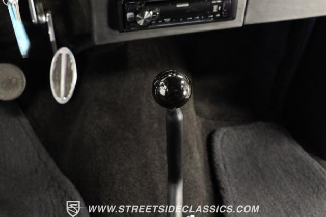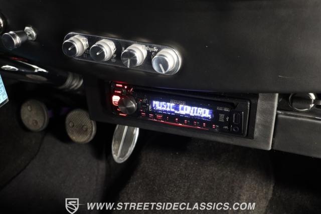 The interior is black with leather bucket Glide seats and door panels. There\'s a shifter on the floor for slamming gears, an easy-to-grip custom steering wheel, and a tilt IDIDIT steering column. To the left is a set of AutoMeter gauges, below that are VintageAir climate controls, and below that sits a Kenwood head unit with AM/FM/CD/Aux and Bluetooth. It\'s tough to find any flaws here-even the trunk is large and lined with clean carpeting.