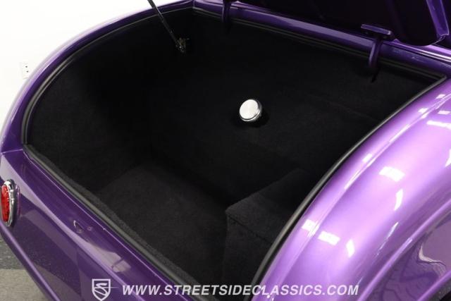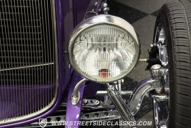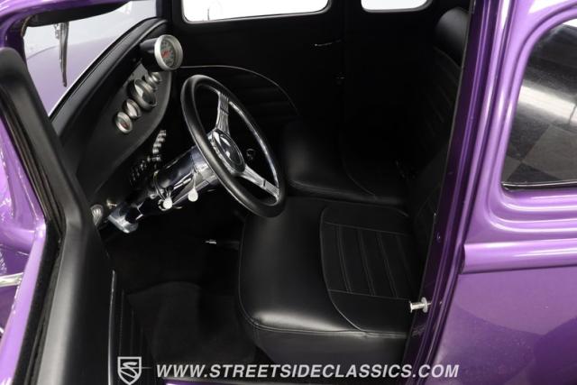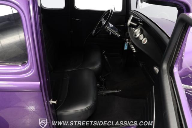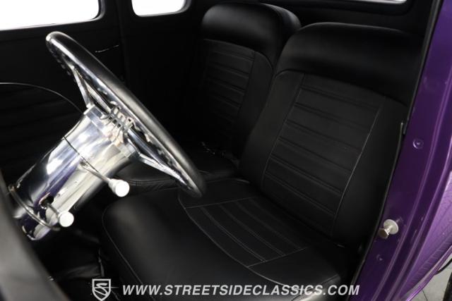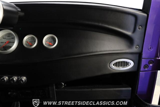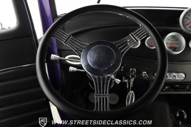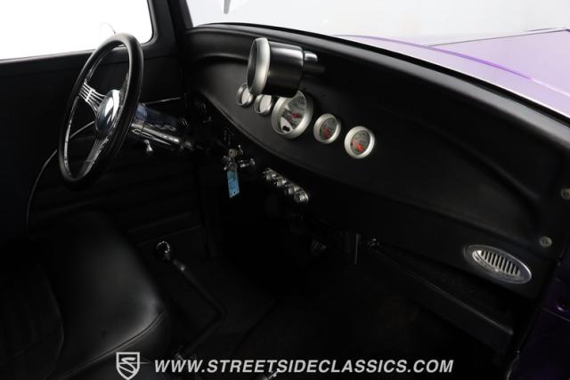 The engine bay is another standout area of this street rod. The engine is painted purple, the aluminum valve covers feature purple stripes, and there\'s a chrome alternator and intake-just a lot of sharp-looking parts. A Quick Fuel carburetor adds to the upgrades, along with a Walker aluminum radiator and electric fan. Power comes from a 350 stroked out to a 383 cubic-inch V8, paired with a Muncie M20 4-speed manual transmission, sending power to a 9-inch Ford rear axle with 3.73 gears.