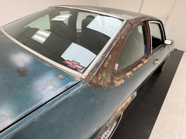 White plastic and vinyl door panels are remnants of this mid sized luxury version and show their age with some soiling and discoloration and other than the driver\'s armrest, both are intact. Suddenly, you enter the modern century with racing bucket seats in black and blue vinyl and not just in the front, but two in the back as well! That\'s not something you see every day. Up front, a later model Chevrolet steering wheel fronts the standard instrument cluster behind a cloudy plexiglass shield while plastic burl wood provides the dress up faceplate which also frames the AM/FM/Cassette player. To the right, an aluminum plate houses three added gauges under a heavily cracked dash pad with carpeted cover. A B&M shifter resides on the transmission tunnel and black carpet covers the floor and up above, we have headliner delete. The trunk holds a bright blue fuel cell and keeping with the Monster theme on the outside, loose cans of Monster might add some extra sound to the drive.