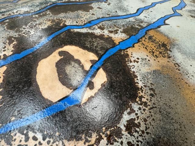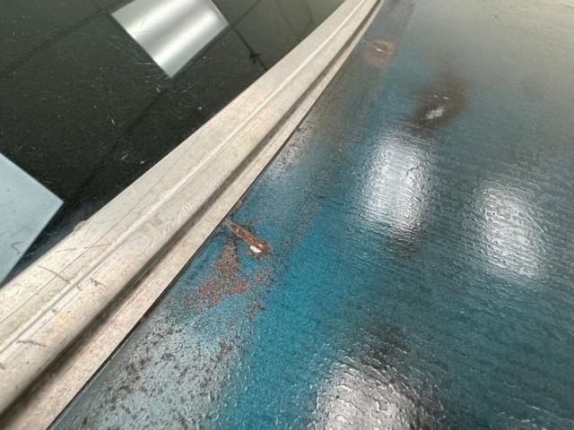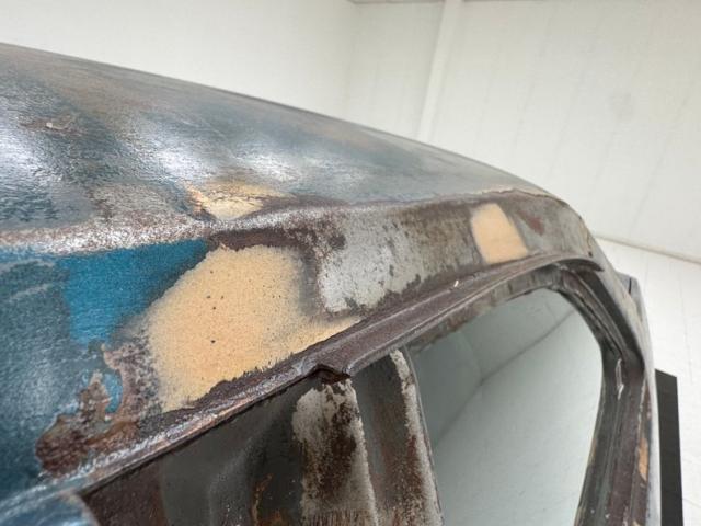 There are remnants of the original Dark Aqua paint, but not much. We have heavy patina throughout, especially on horizontal surfaces with and with blue painted design and some clear coat, it feels intentional rather than a car in actual decline. Chipped, cracked, faded, bondo\'d, scratched, scraped, patched, and rusted, it\'s more of a statement rather than a sign of neglect. The B-pillar includes some artful red, white and blue paint additions and 14-inch Buick Rally wheels fill the openings with white wall tires and red lug nuts. Up front, the squareness of the fascia has been tempered by LED halo headlights that give the car a slightly menacing glare while out back, the Concours only triple unit tail lamps are in place.