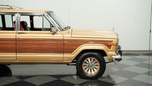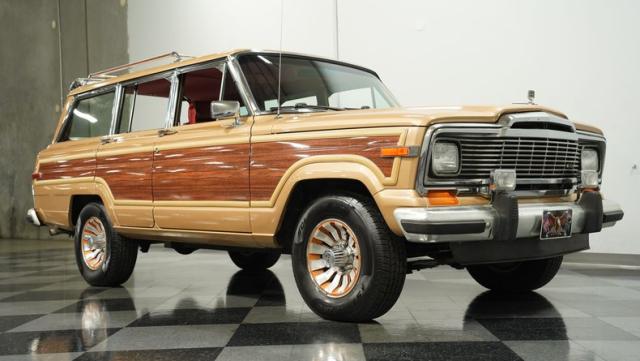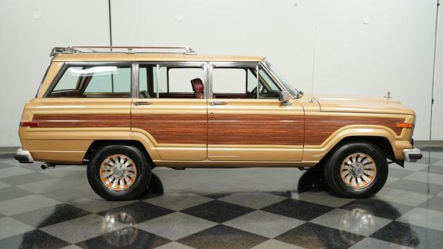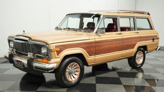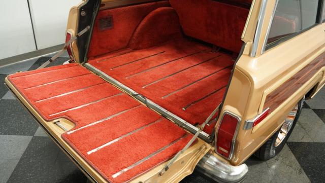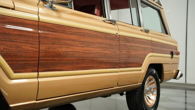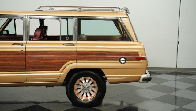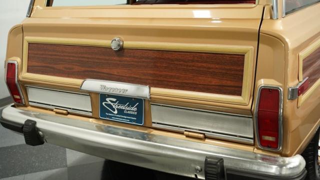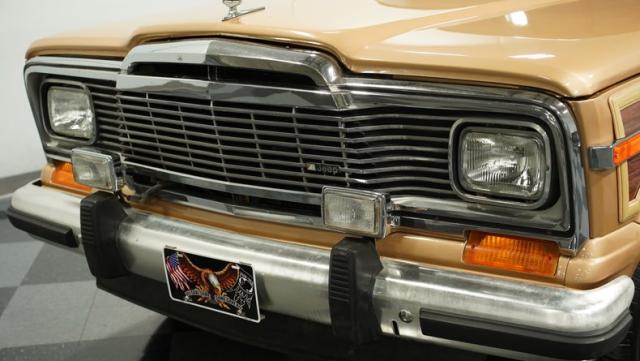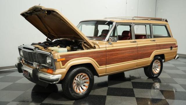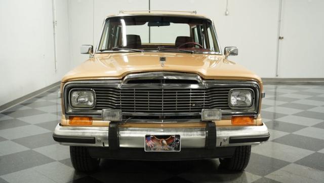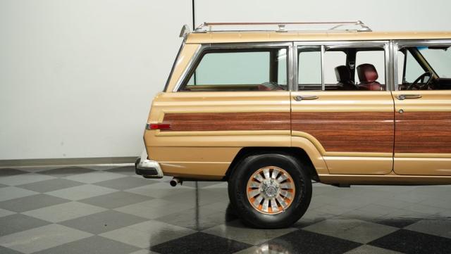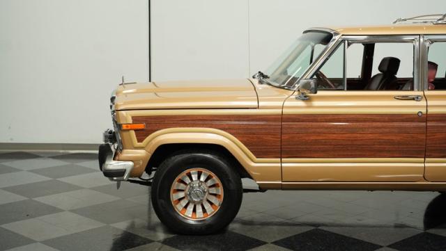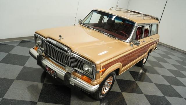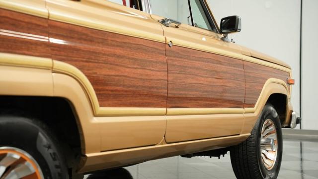 This 1985 Jeep Grand Wagoneer, an emblem of adventure, wraps family outings and vacations in its Champagne Metallic embrace, highlighted by freshly applied wood trim style decals. Its exterior, having received a higher-than-average quality respray, shines under the sun, inviting onlookers to glance back as it passes. The presence of original bumpers, grill, roof rack, and bright window trim adds a touch of authenticity to its adventurous spirit. Riding on 15\" wheels encased in 235/75-15 tires, this vehicle stands ready to tackle both the beaten paths and those less traveled. All windows, including the tailgate power window, operate smoothly, ensuring nothing comes between you and the great outdoors.