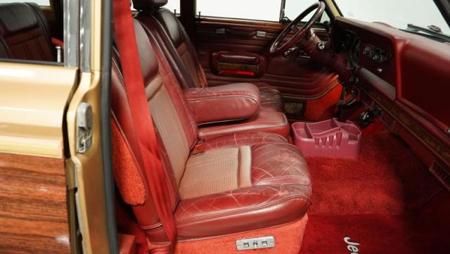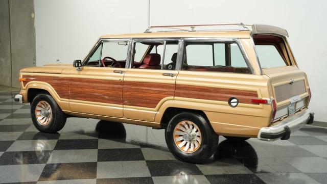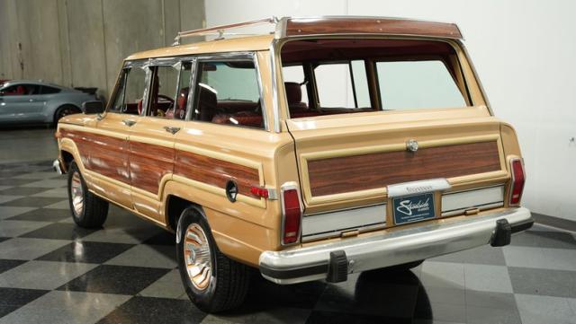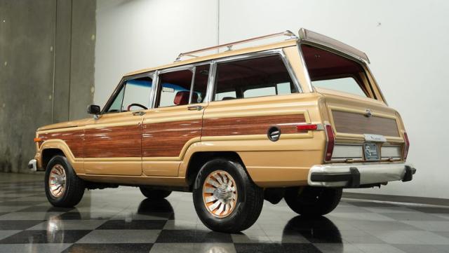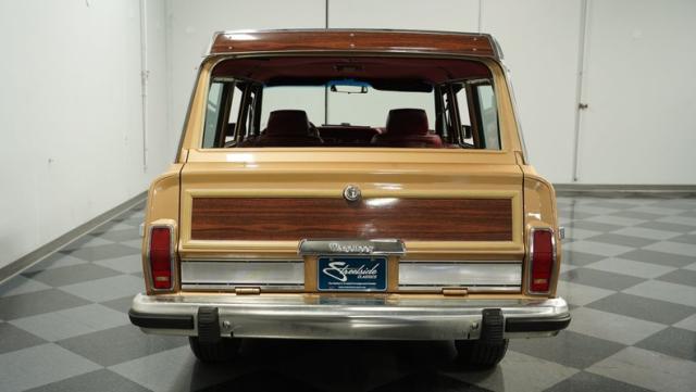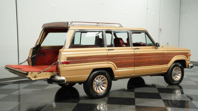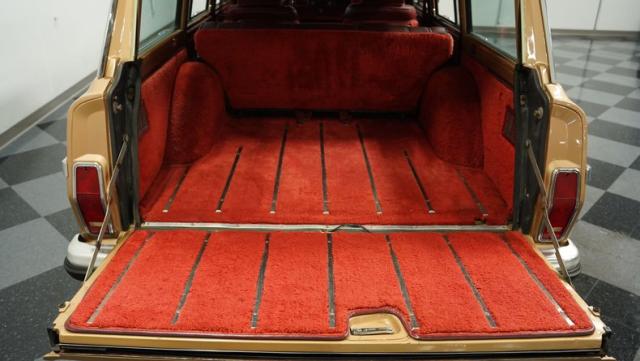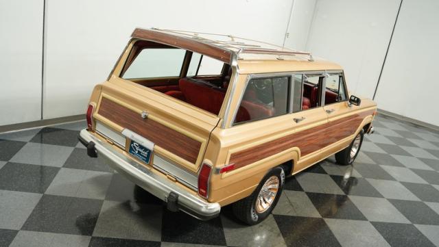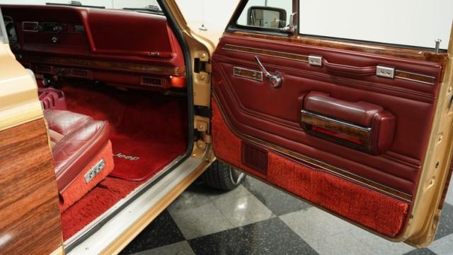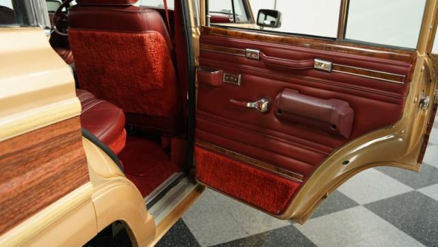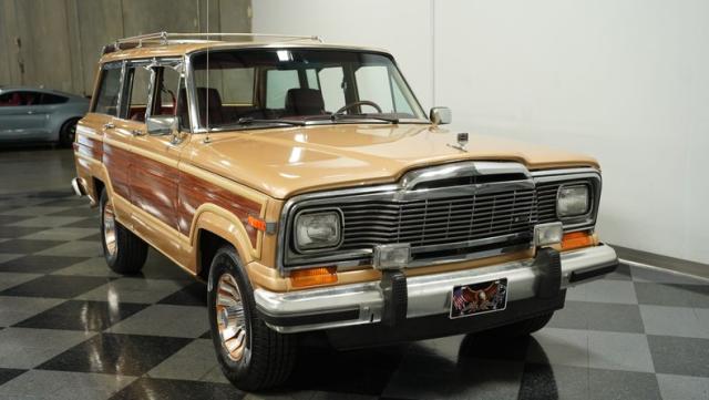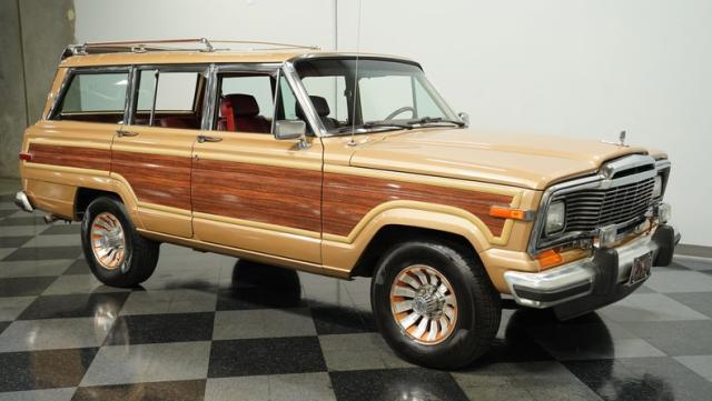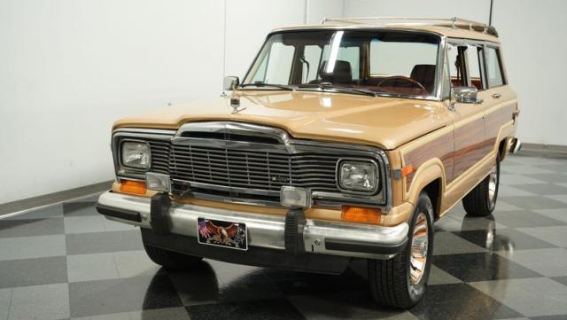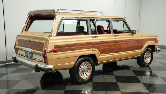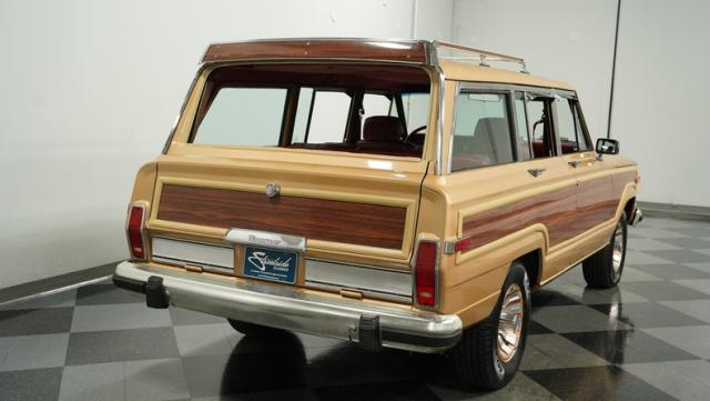 This 1985 Jeep Grand Wagoneer, an emblem of adventure, wraps family outings and vacations in its Champagne Metallic embrace, highlighted by freshly applied wood trim style decals. Its exterior, having received a higher-than-average quality respray, shines under the sun, inviting onlookers to glance back as it passes. The presence of original bumpers, grill, roof rack, and bright window trim adds a touch of authenticity to its adventurous spirit. Riding on 15\" wheels encased in 235/75-15 tires, this vehicle stands ready to tackle both the beaten paths and those less traveled. All windows, including the tailgate power window, operate smoothly, ensuring nothing comes between you and the great outdoors.