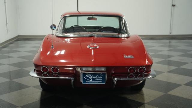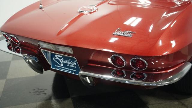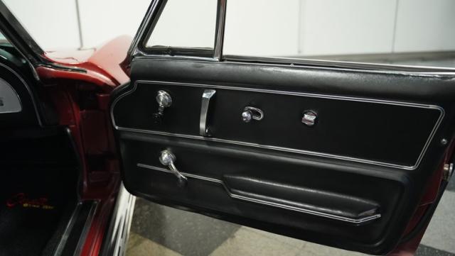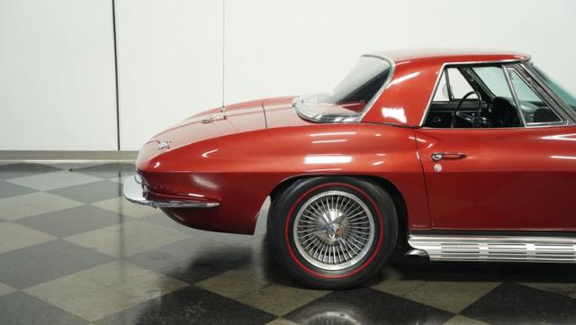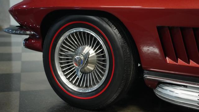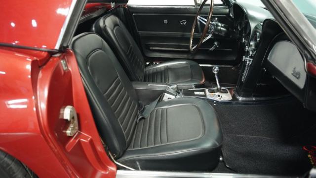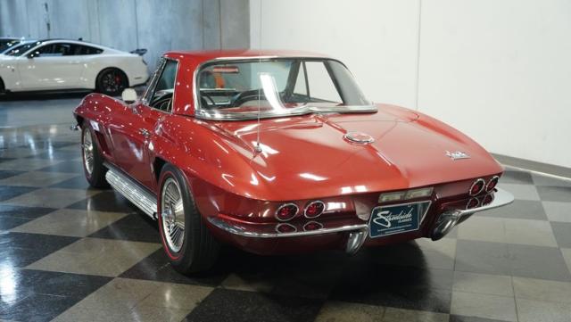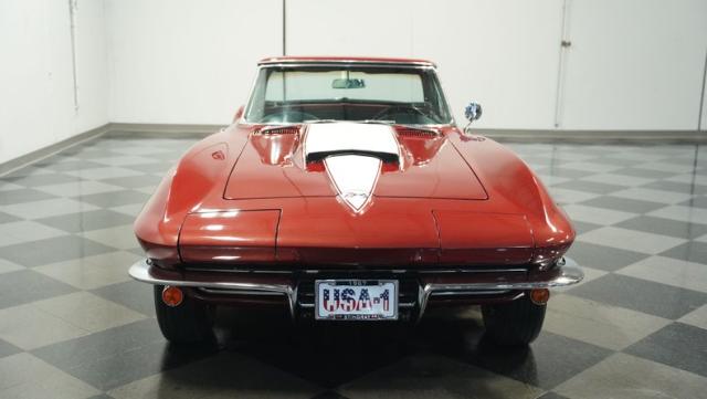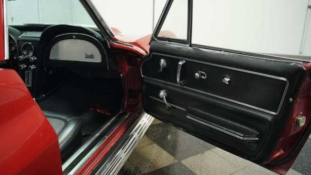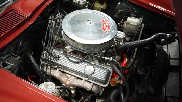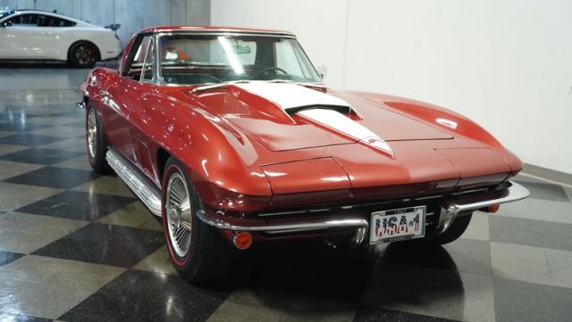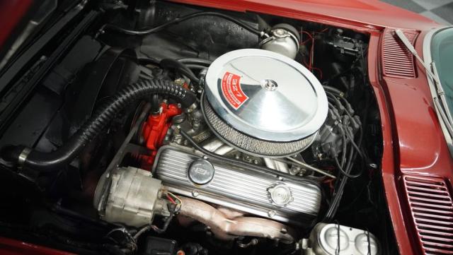 Although powered by a healthy small-block engine, this car has been fitted with a big block \"Stinger\" hood accented with a white stripe. Other exterior highlights include rumbling factory-style side exhaust and a matching Marlboro Red removeable hardtop as well as a folding soft top. A set of factory-style finned knock-off wheels wrapped with redline radial tires complete the factory performance look of this stylish Corvette. The black interior is in excellent condition and is stock in appearance.