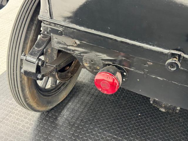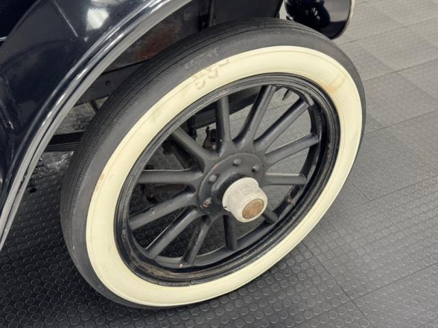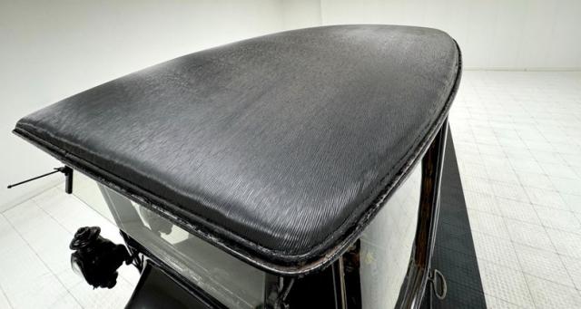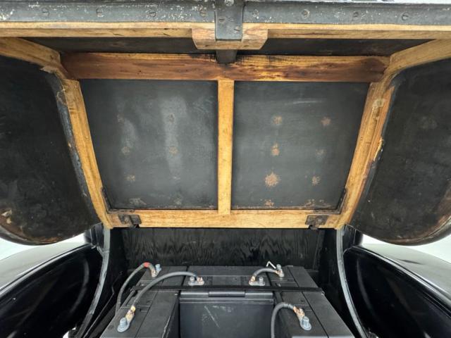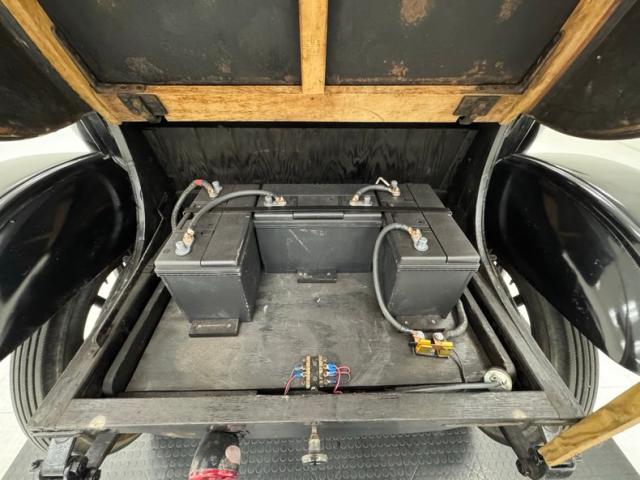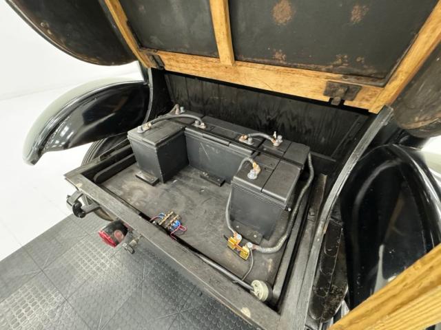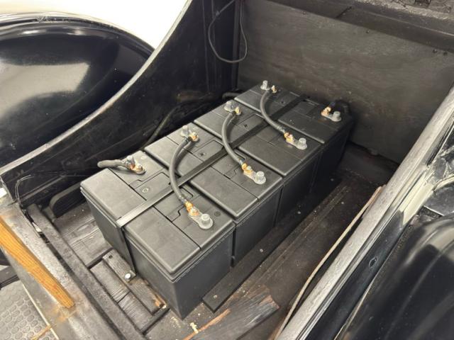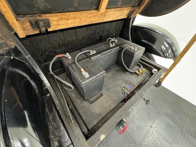 Like just about everything else from this era, the upright car presents in solid black, including the 32-inch wooden spoke wheels carrying white wall tires that offer some contrast. Cowl lamps also wear a coat of black, fronting a cabin that is supplied with tall windows and a high roof, requiring a step onto the running boards for entry. Without water to cool, there is no front grille and the front resembles the turtle trunk of a Model T, matched in style by the actual rear trunk lid of this car which houses a series of batteries. A pair of headlights perch low in front and a stylish lip encircles the arching fenders, while a textured vinyl roof presents in very nice condition. There\'s some uneven paint on the cowl but overall, the body and paint are in great shape.