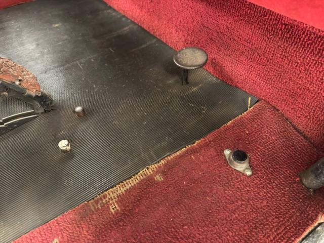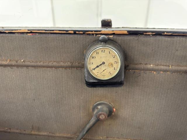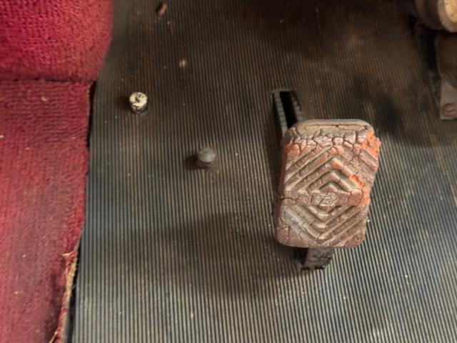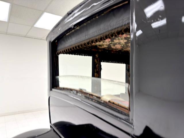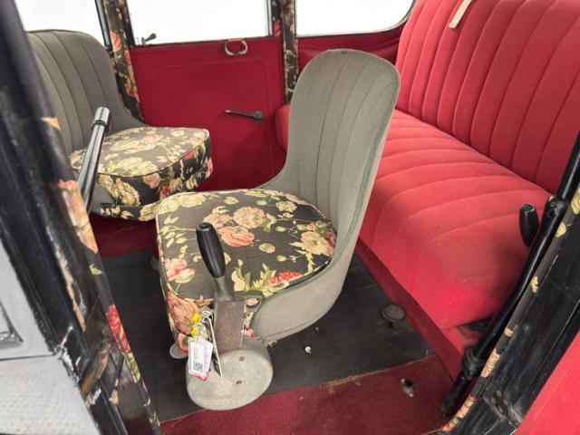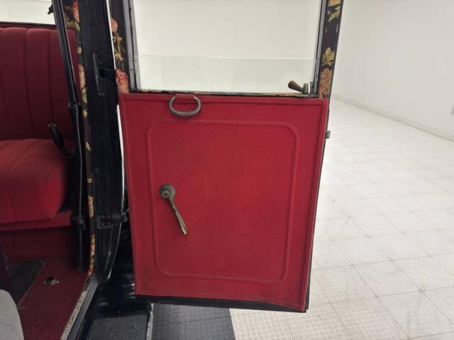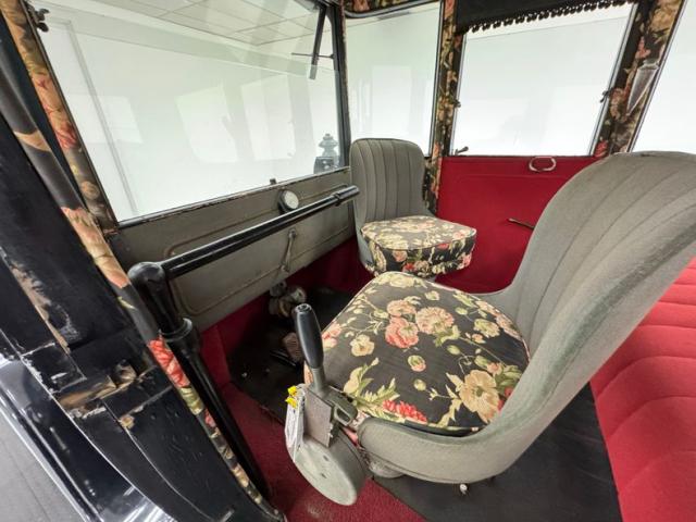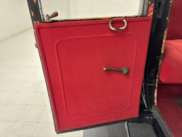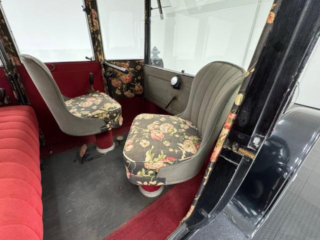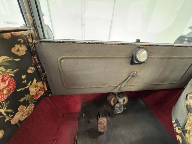 Victorian era influence is noted on the inside with hardware, red velvet-like doors and floral print dressing the walls and ceiling. That floral design is also used on the front bucket seats, while the red covers the rear bench and tillers are noted on the left side of both rows. Gray cloth, with some patina, covers the dashboard which houses a period clock while gauges are placed close to the floor in the center with a combination of rubber matting and red carpet covering the floor.