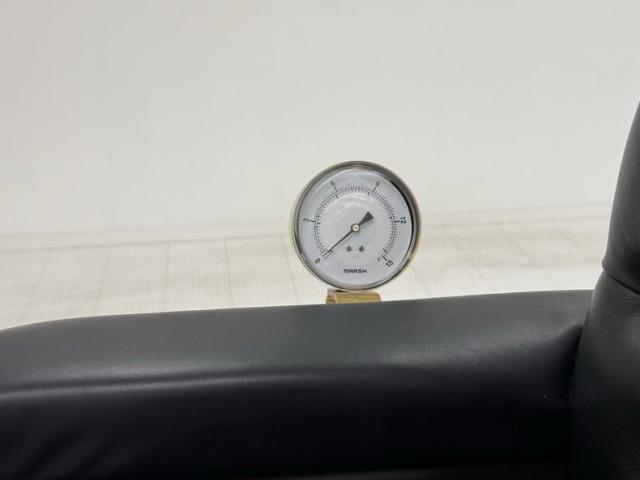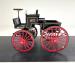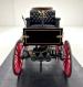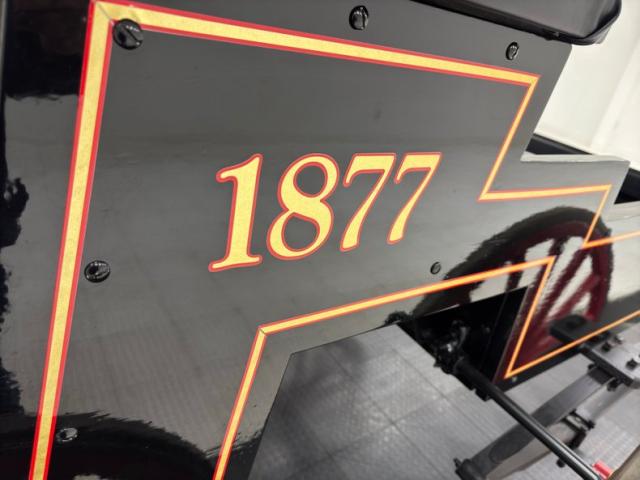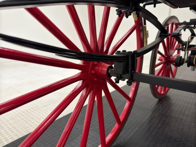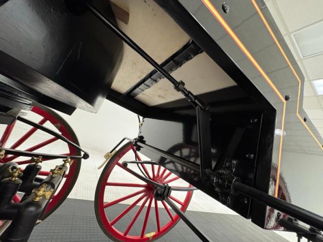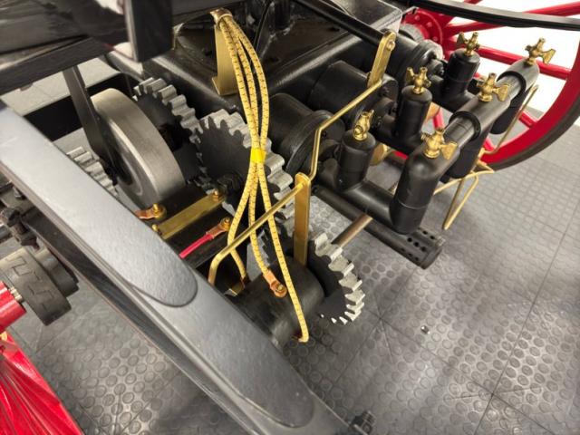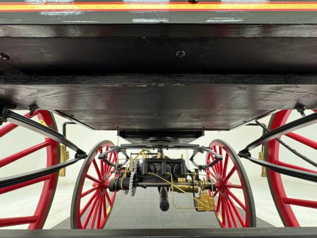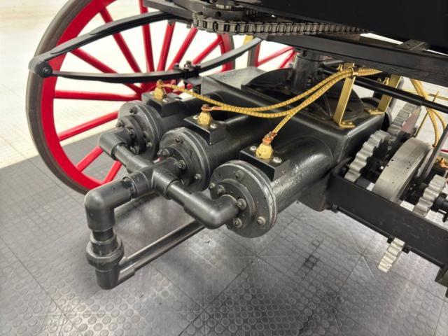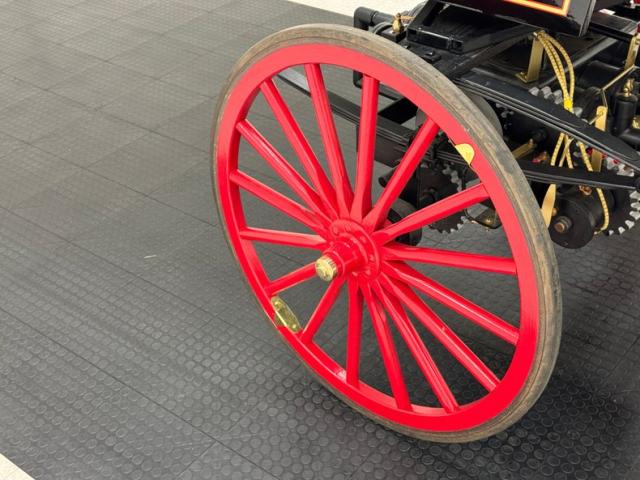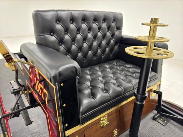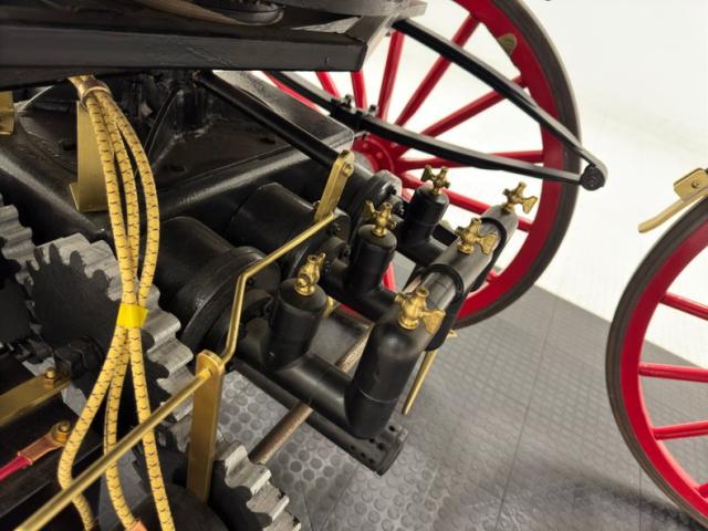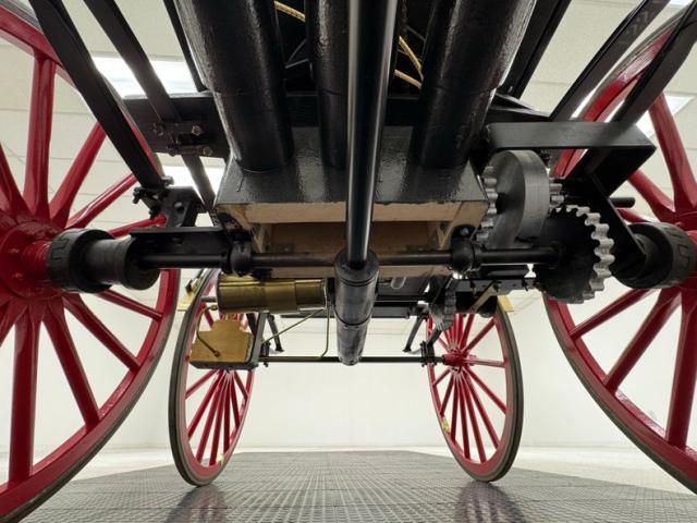 Glossy black paint adorns the wood construction of the Selden with gold trim and graphics that are bordered in red, the perfect complement to the red wood spoked wheels with the rears being larger than the fronts which have a lower axle to accommodate the engine. The visible powertrain wears a coat of shiny charcoal paint with contrasting yellow ignition wires and chunky metal cogged gear wheels that transfer power to the axle. Brass hardware is found throughout the exterior including on the front light posts, valves on the engine, the brake, and wheel hardware. Buggy springs make up the suspension for this motor wagon.