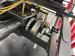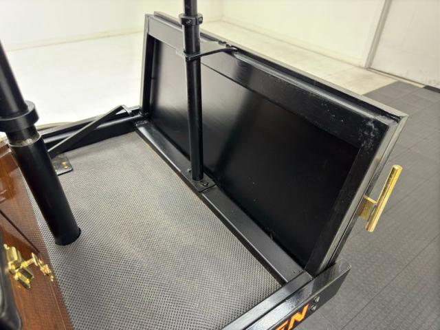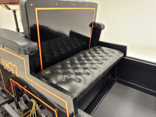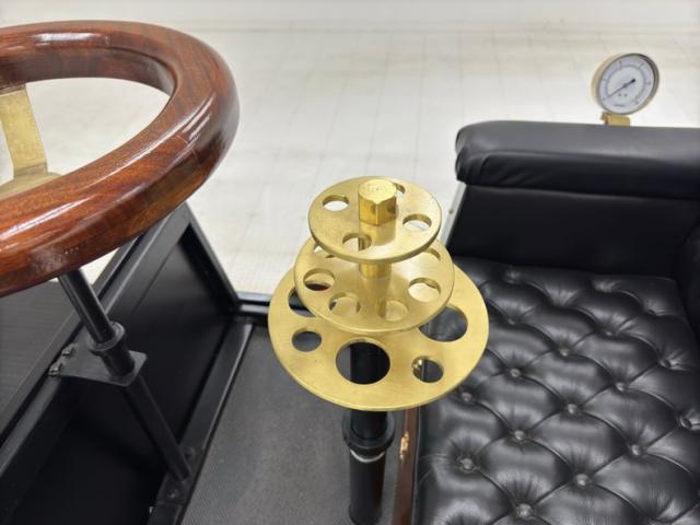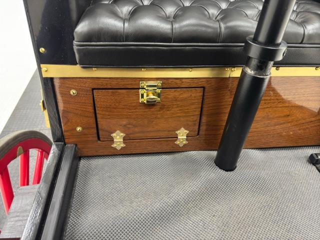 A diamond tufted black vinyl bench seat is provided to guests in the back as well as to the driver in front, who is at the helm, controlling the vehicle with a wood rimmed brass steering wheel that sits horizontal with a crude pedal to the far left. Polished wood is under the driver providing a storage compartment adorned with more brass hardware and the floor is coated with a rubberized mat.