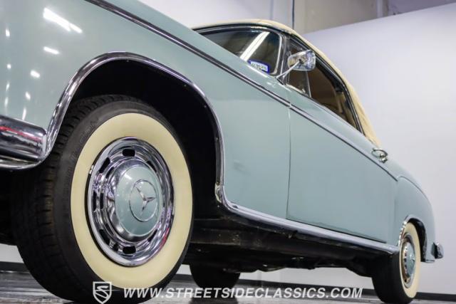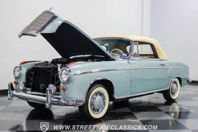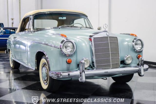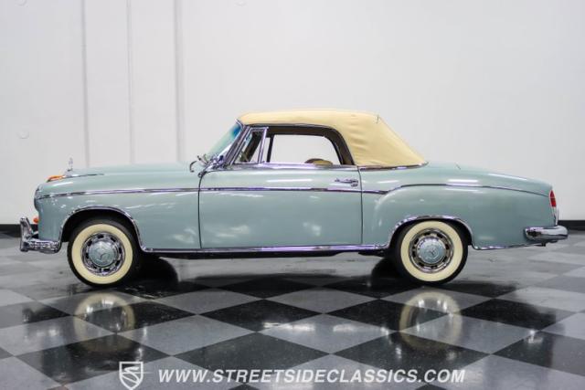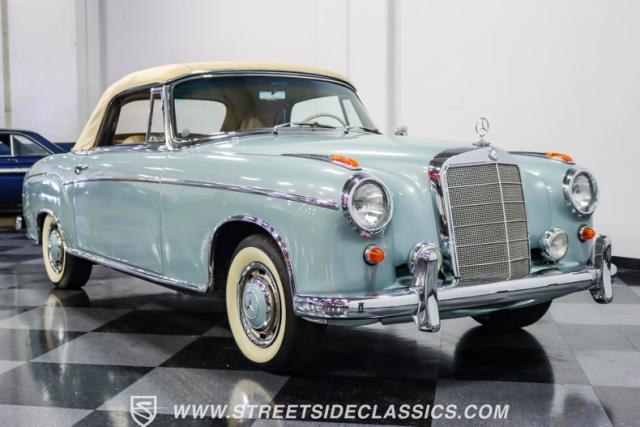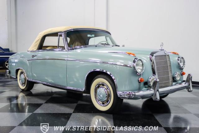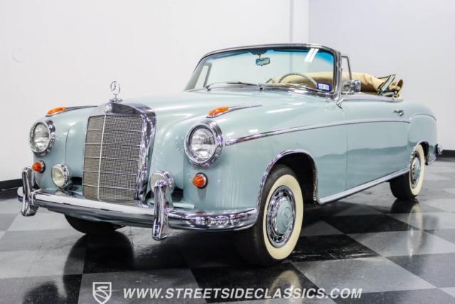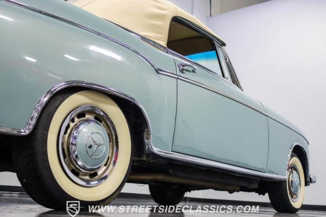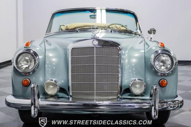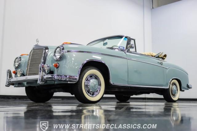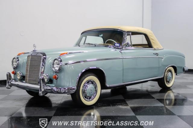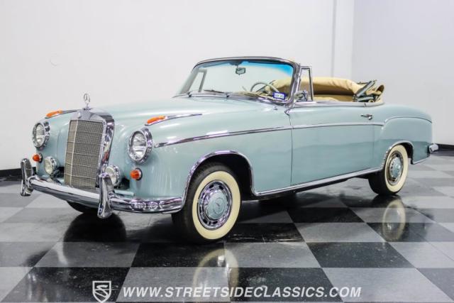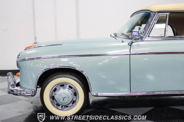 This 1959 Mercedes-Benz 220S Cabriolet exemplifies automotive artistry, with fewer than 2,200 produced over four years due to meticulous hand-finishing. The blue exterior radiates sophistication, a hallmark of Mercedes\' design prowess. A tan cloth convertible top creates an elegant contrast, ideal for scenic drives. Gleaming chrome accents accentuate the car\'s graceful contours. This classic Mercedes glides on 15-inch wheels, adorned with BFGoodrich Silvertown 185/80R15 tires, marrying vintage allure with modern road manners.
