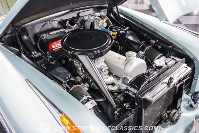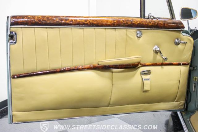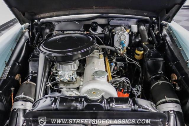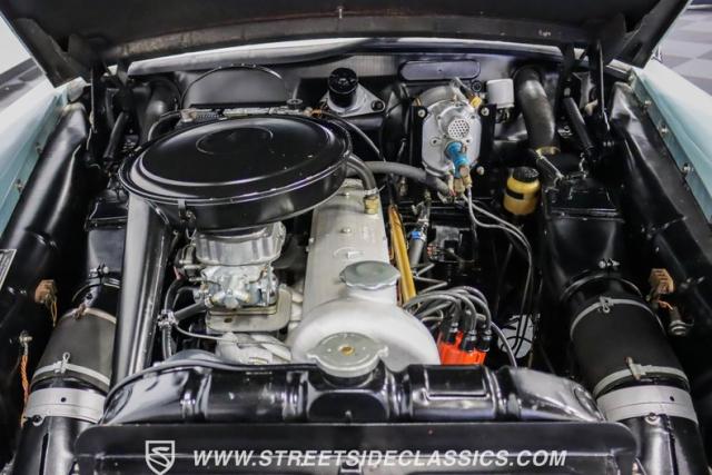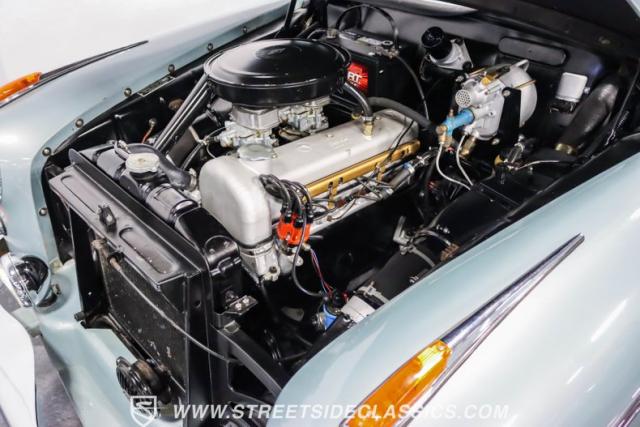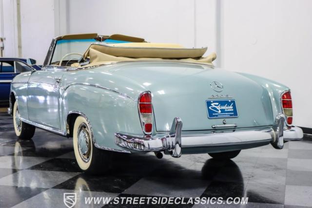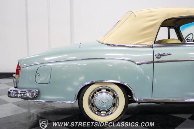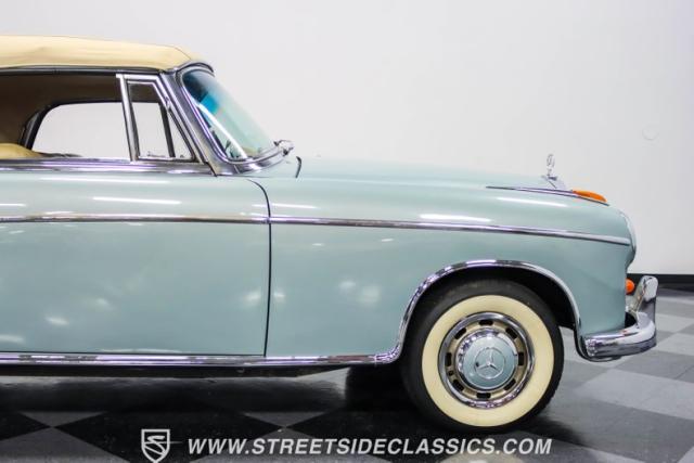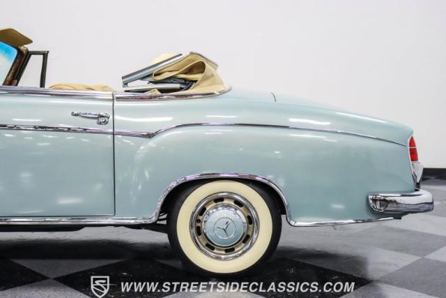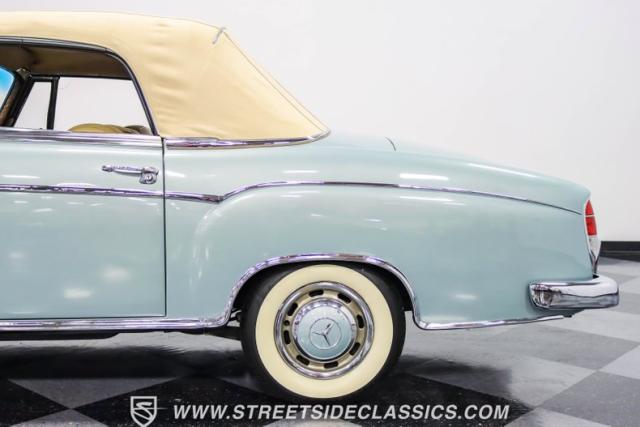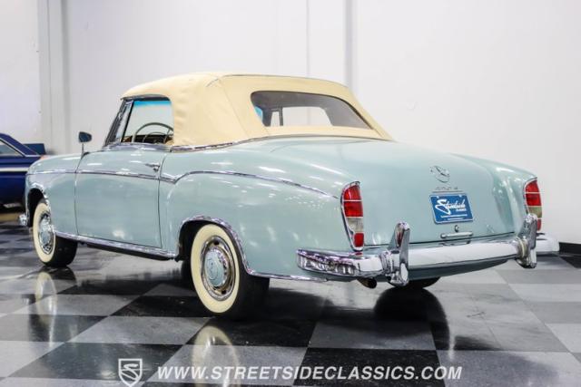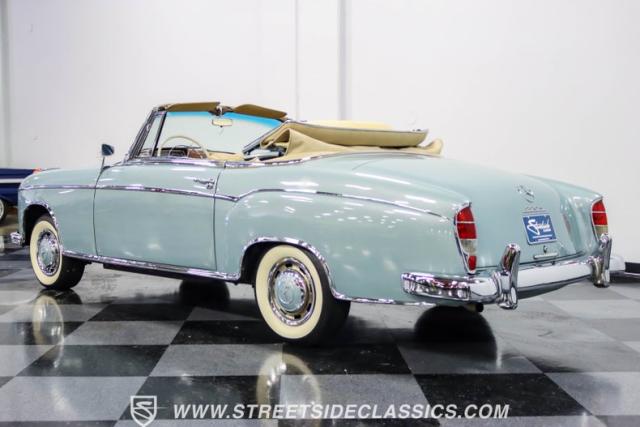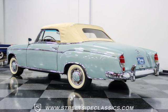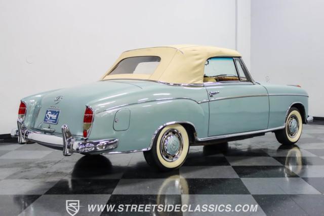 This 1959 Mercedes-Benz 220S Cabriolet exemplifies automotive artistry, with fewer than 2,200 produced over four years due to meticulous hand-finishing. The blue exterior radiates sophistication, a hallmark of Mercedes\' design prowess. A tan cloth convertible top creates an elegant contrast, ideal for scenic drives. Gleaming chrome accents accentuate the car\'s graceful contours. This classic Mercedes glides on 15-inch wheels, adorned with BFGoodrich Silvertown 185/80R15 tires, marrying vintage allure with modern road manners.