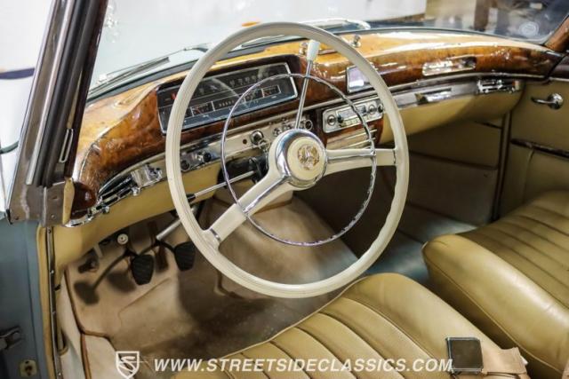 The cabin showcases a masterfully crafted tan leather interior, speaking volumes about mid-century luxury. Supportive bucket seats and a column-mounted shifter blend comfort with practicality. A Euro-style Blaupunkt radio graces the dashboard, potentially an original dealer addition, enhancing the period ambiance. Exquisite wood grain accents throughout the interior highlight Mercedes-Benz\'s renowned attention to detail. This cabin creates an inviting atmosphere for discerning classic car aficionados.