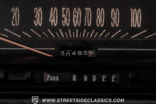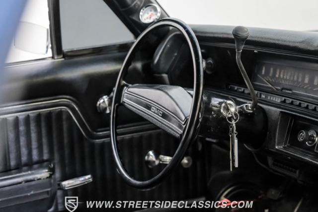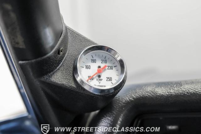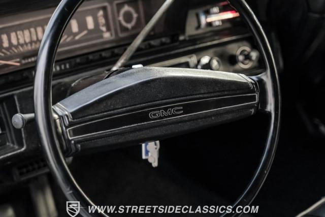 The black interior features a comfortable bench seat, original GMC logo steering wheel and a retro-style AM/FM/AUX stereo with Bluetooth capabilities. Additionally, there is a SunPro temperature gauge mounted on the driver\'s side A-pillar. The driver and passenger are kept cool with an upgraded Vintage Air system.