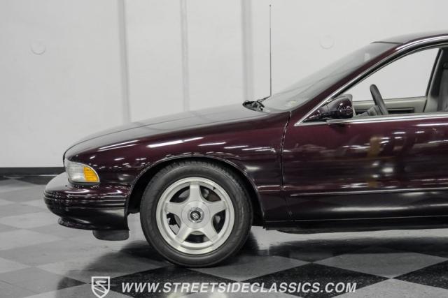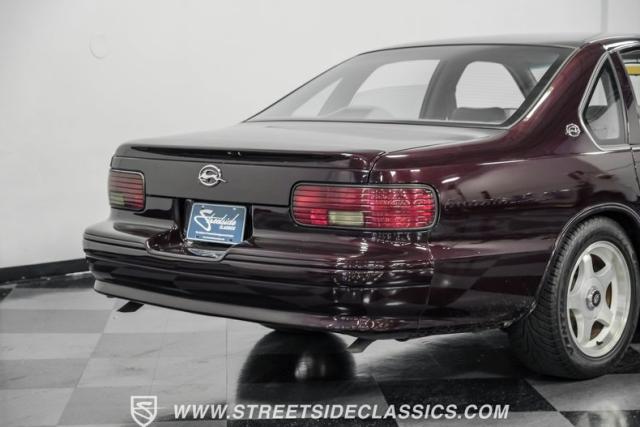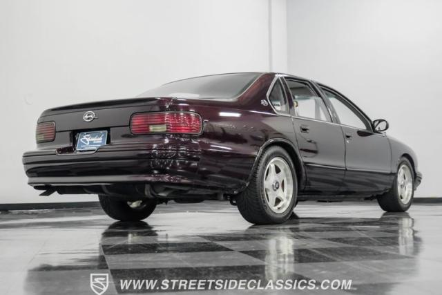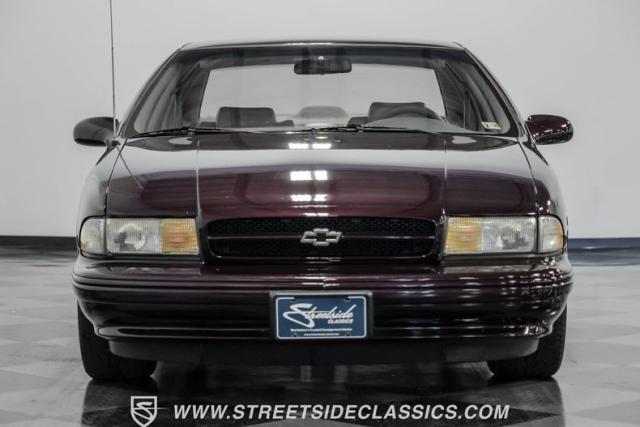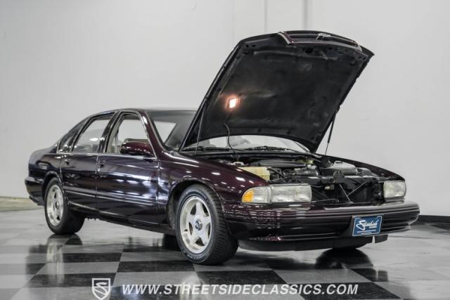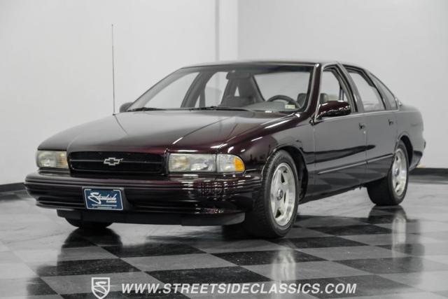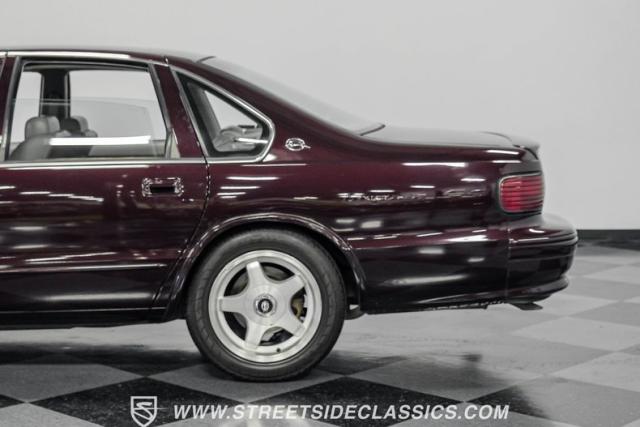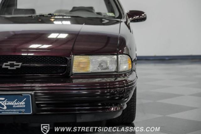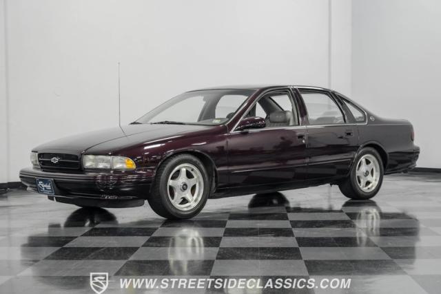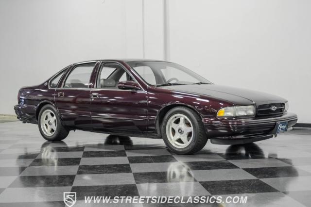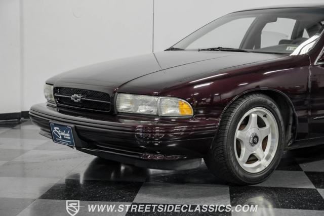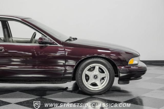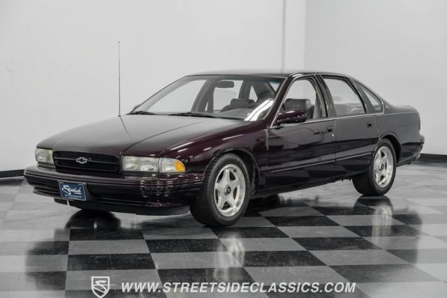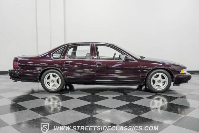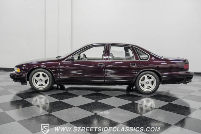 This 1996 Chevrolet Impala SS sports a Dark Cherry Metallic paint job that accentuates its muscular lines. The sleek, aerodynamic body style differentiates it from boxier sedans, with a low-slung profile emphasizing its performance heritage. Chrome 17-inch wheels fill the wheel wells, fitted with beefy 255/50R17 tires. A monochromatic exterior treatment gives this Impala SS an aggressive look. Clean body panels showcase the car\'s powerful stance, while minimal chrome accents maintain its stealthy appearance.