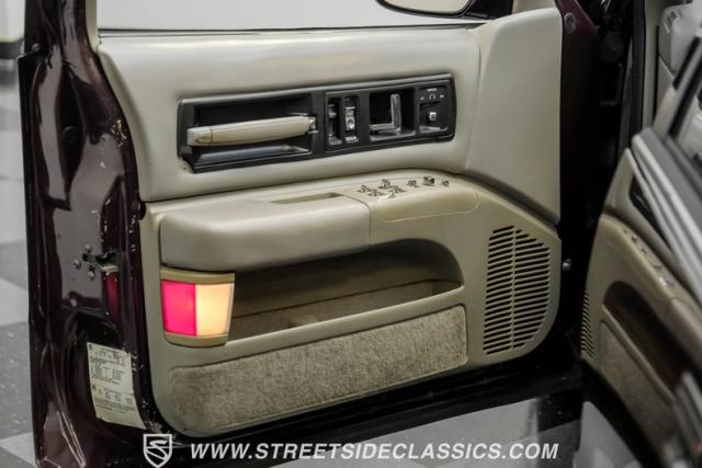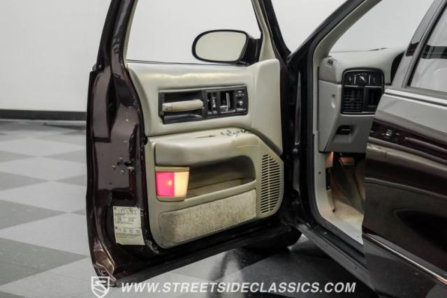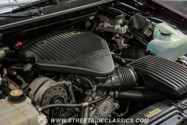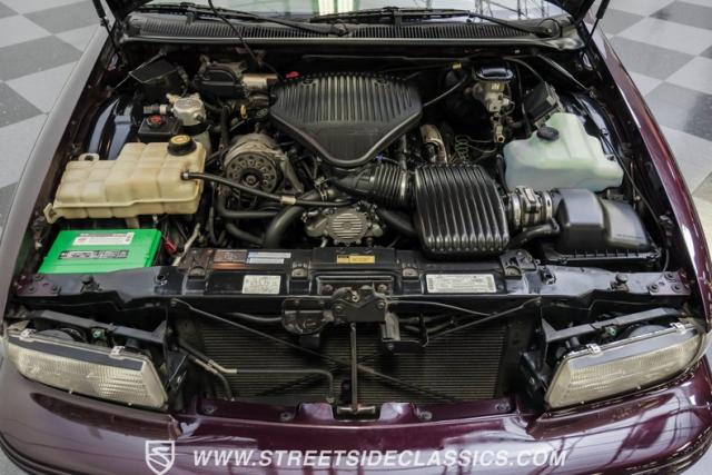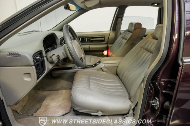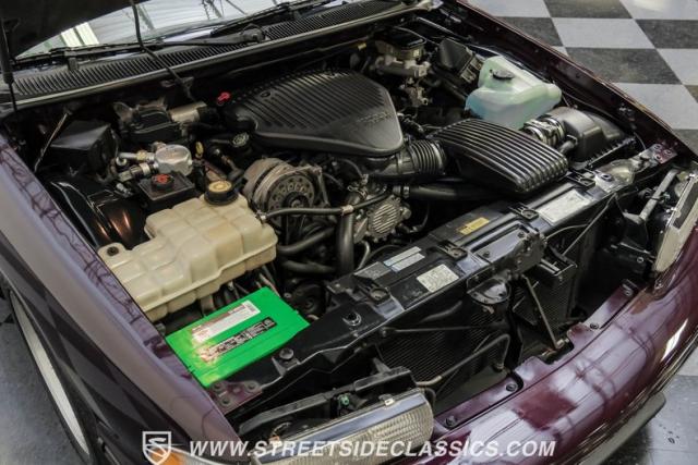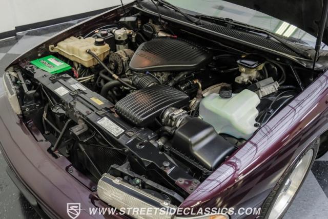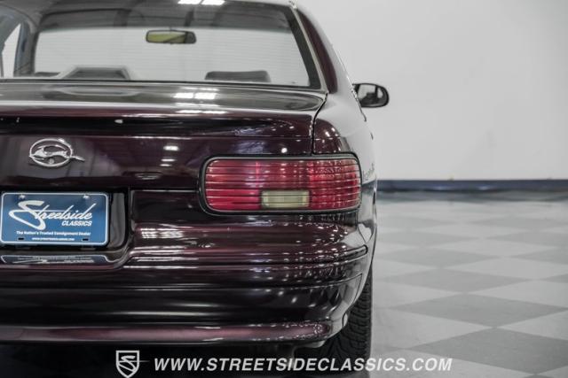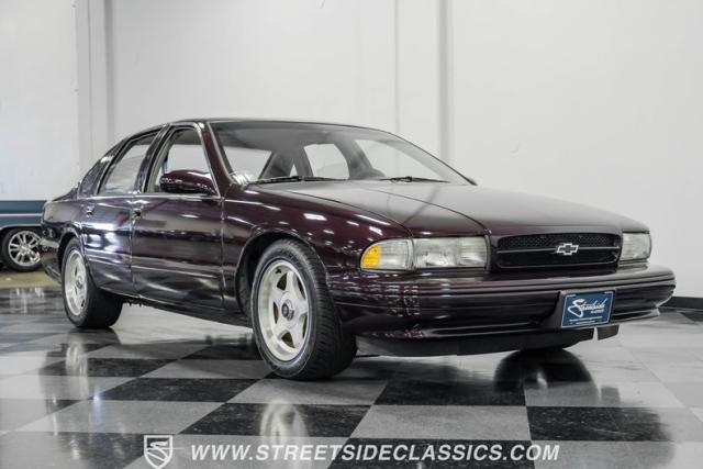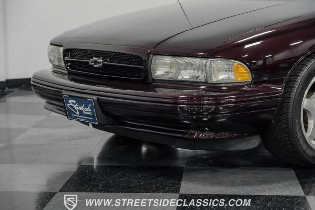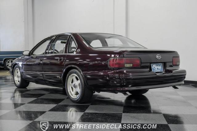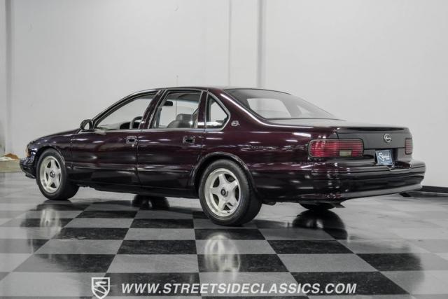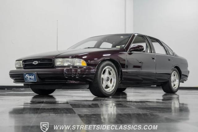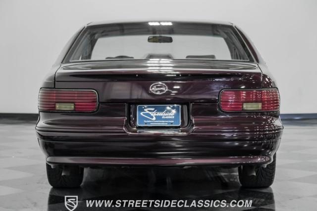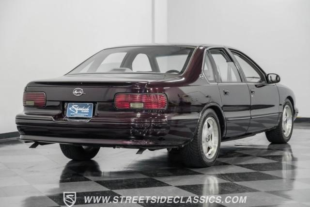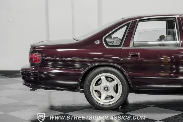This 1996 Chevrolet Impala SS sports a Dark Cherry Metallic paint job that accentuates its muscular lines. The sleek, aerodynamic body style differentiates it from boxier sedans, with a low-slung profile emphasizing its performance heritage. Chrome 17-inch wheels fill the wheel wells, fitted with beefy 255/50R17 tires. A monochromatic exterior treatment gives this Impala SS an aggressive look. Clean body panels showcase the car\'s powerful stance, while minimal chrome accents maintain its stealthy appearance.