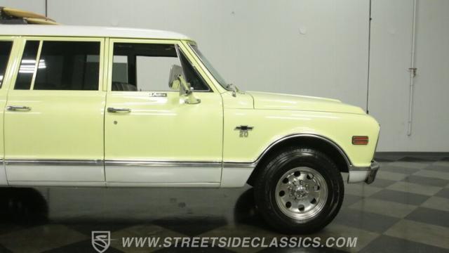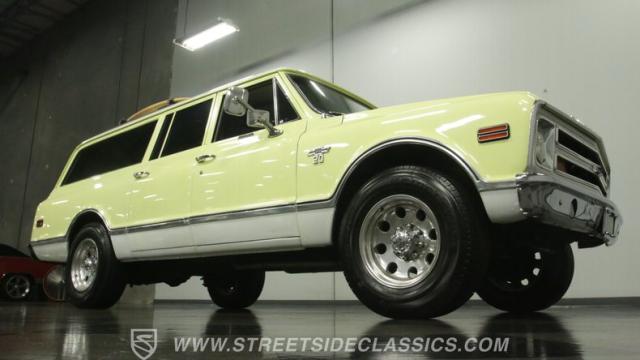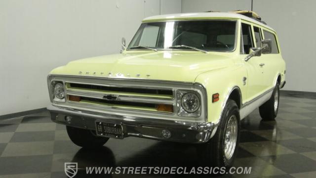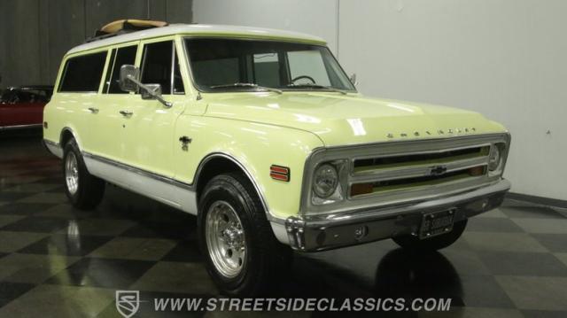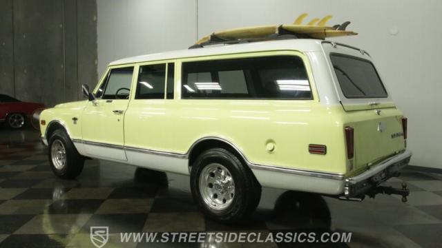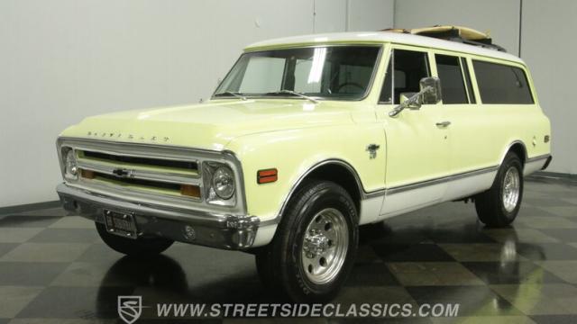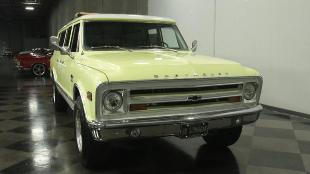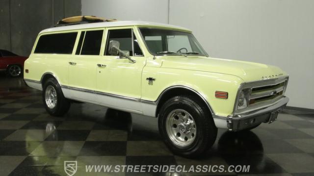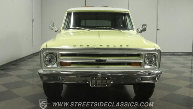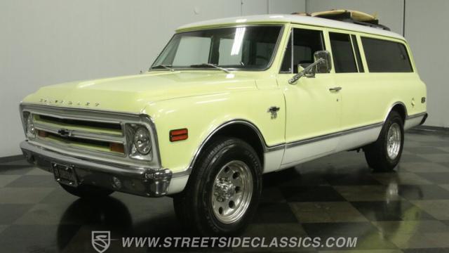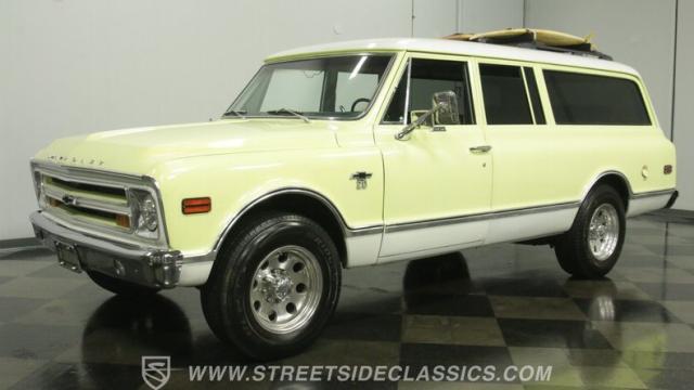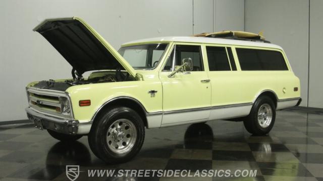 This 1968 Chevrolet C20 Suburban is both practical and attractive with its classic two-tone, cavernous three-row A/C interior, and a powertrain with a fuel-injected LS1 V8 and overdrive transmission.