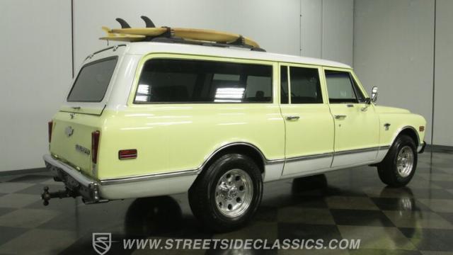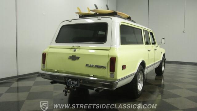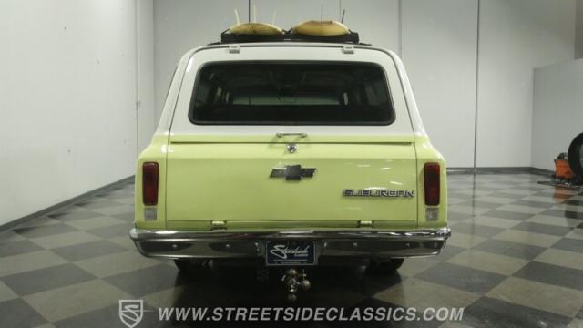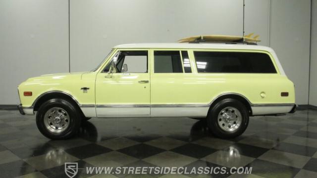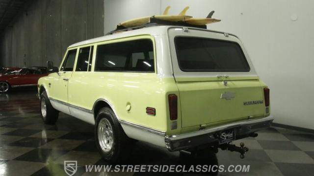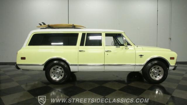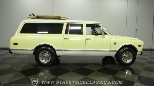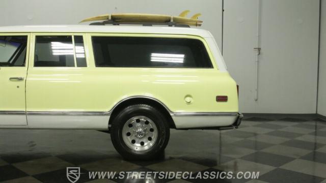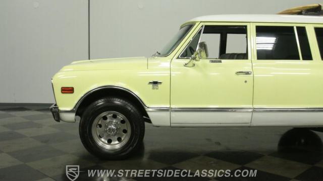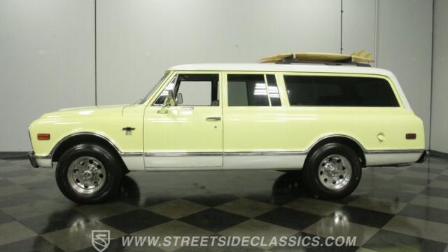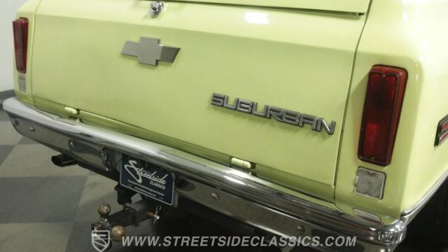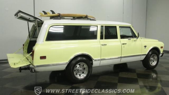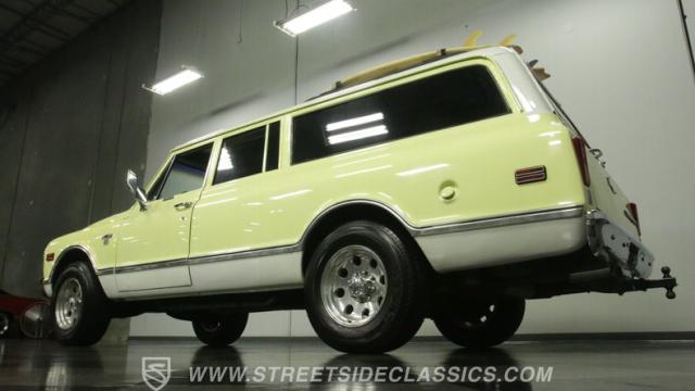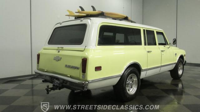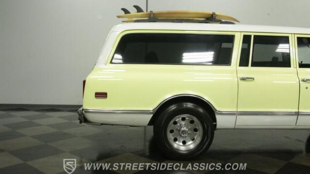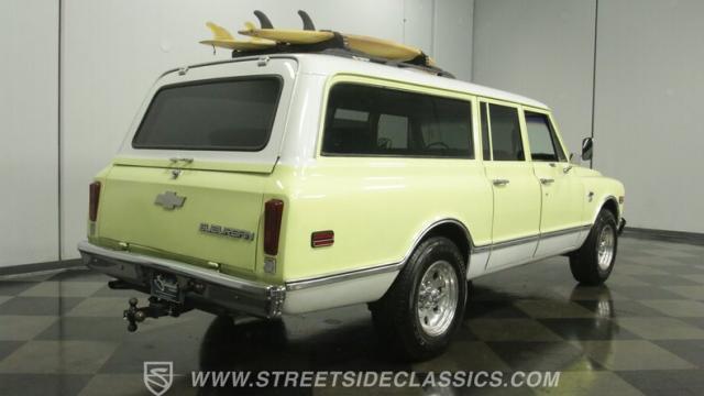 The well-developed line of Chevrolet\'s C/K trucks is truly iconic today, and so it only gets better on a less frequently seen Suburban. And we like the premium details, like the bright chrome bumpers, surf-style white roof, and the full-length trim that cleanly separates the yellow and lower white of this two-tone presentation. There are even nice upgrades for a better cruiser, like the fog light bumper and clear tri-bar headlights. It\'s quite an attractive package, but there are still the right signs of use to make sure no one sees this as just a glamor machine. You see this spirit in features everywhere from the surfboards on the roof rack to the upgraded HD-style 8-lug wheels.