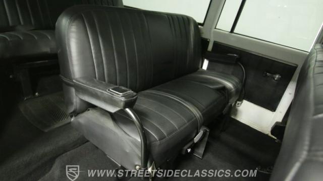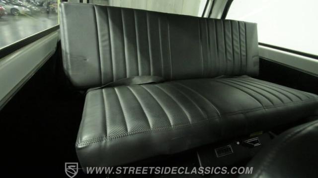 The interior has a clean look on the carpeting, door panels, and nicely textured upholstery. It\'s made to be a better driver with a sports steering wheel, tilt column, billet gear selector, and a backup camera mounted between the sun visors. There are also nice features for everyone, like air conditioning (it may need a recharge) and tinted windows. The classic Suburban setup does not have a rear door on the \"traffic side\" for safety sake, but it also serves a nice purpose for practicality. When you have a three-row setup like this, one door allows for an entry space on the offset middle row. So it\'s easy for adults to get in and out of all rows of seating. And not only can you carry plenty of family and friends, but there\'s still room in here for plenty of cargo. It makes for one of the most practical and useful classics around.