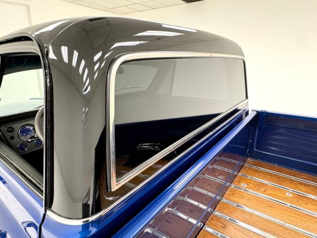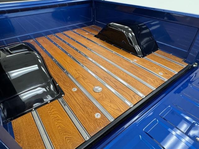 Handsome black vinyl door panels are robustly padded and stitched and are occupied with sporty drilled hardware while inside, TMI black bucket seats add some contoured throne where there was once likely a flat bench. They include a center console with cupholders and the dash gets a true street rod treatment with billet steering wheel behind the flame laden red, silver and blue gauges in a silver painted surround. The center stack brings things into the 21stcentury with a touch screen for the AM/FM/CD radio over toggle switches and the A/C controls. Black carpet below, a vinyl padded headliner above, and a bed that is a spotless example of oak planks and stainless rails which can be viewed through the fixed and tinted rear window.