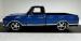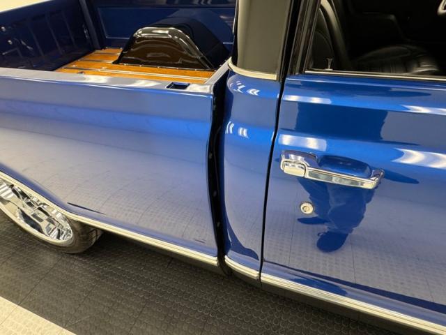 While the paint is stunning, let\'s talk about the spectacular stance of the truck with staggered sized American Racing wheels, 18-inch in front and 20-inch rears, and staggered width tires tucked up into the fenders of this dropped ride. There\'s a well coordinated match with the side molding that runs end to end including over the wheel openings and it delineates the Medium Blue Metallic of the top and the black lower. Couple that with the glossy black coverage of the cab and you\'ve got one outstanding appearance all brought to a crescendo by the tailgate which wears the Chevrolet stamped black band over the chrome bumper. The grille is also surrounded by black and a red bowtie adds a flash of color to the nose. Chipping filler in two lower places and a paint chip or two constitute the only imperfections we could find.
