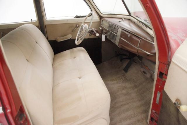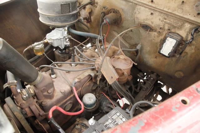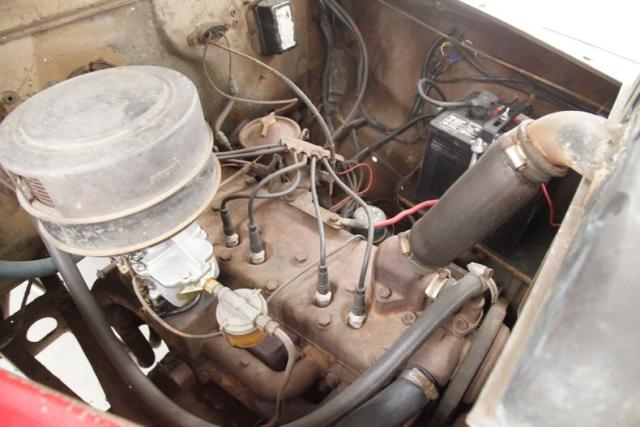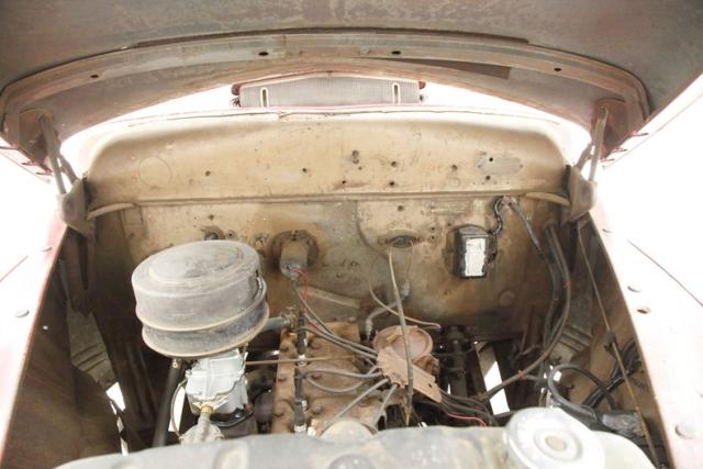 Under the bulbous hood is a 201.3ci L headed inline 6 cylinder engine. It is fed by a rebuilt 1-barrel carburetor and has the original 3 speed manual transmission on back as well as the 4.10 rear axle. Some patina is showing on the sides of the engine bay, and a surface rusted head is noted, as is new wiring and hoses.