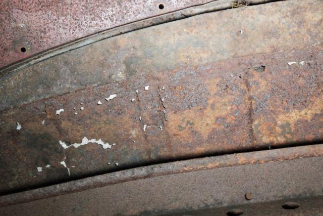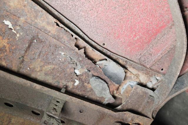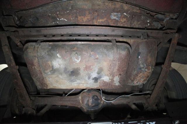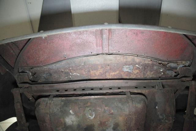 Up on the lift we note a solid but surface rusted X frame with surface rusted floor pans. The rockers have some surface rust as well as invasive rust in areas and we note some invasive rust on the rear filler panel as well as the trunk pan itself. The inner fenders just have patina paint and road dirt. Surface rust is noted in independent coil sprung front suspension and rear leaf springs. Also,it\'s got all new drum braking on the 4 corners.