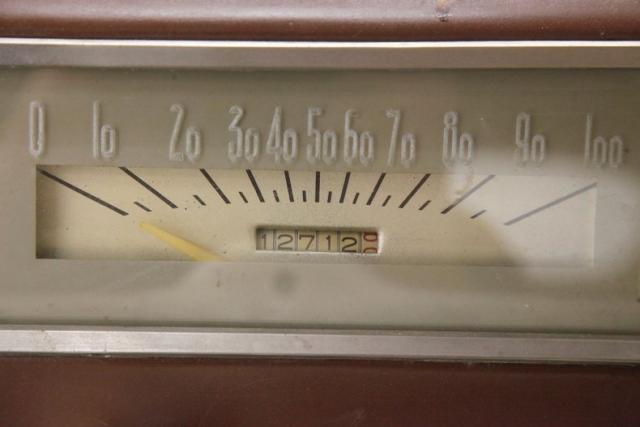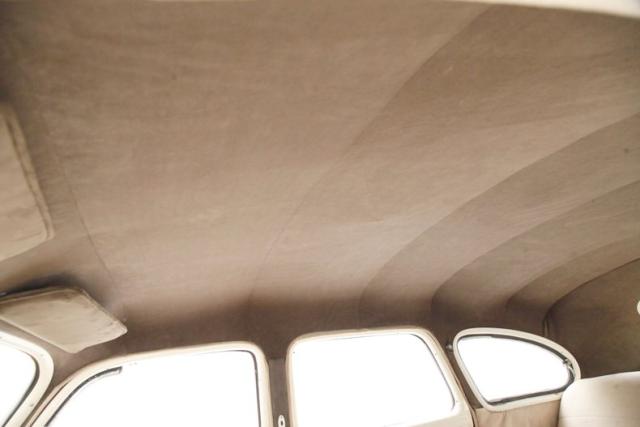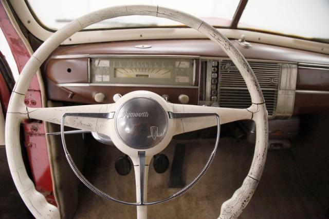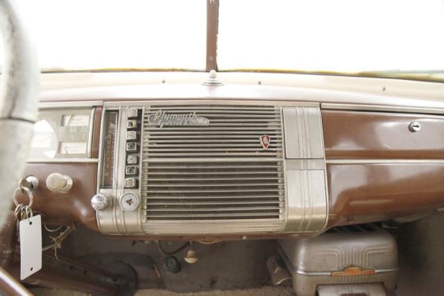 A swing of the doors and we see a beige and brown modern version of mohair fabric with original cranks and levers, bakelite knobs and chromed levers and bezels, and this is just the door panels! Slipping inside I can feel the newness of these broadcloth covered seats, with beige inserts and bolsters with some nifty stitching and a few buttons thrown in for good measure. The front bench and rear solid bench are in upholstered tubs, and float in clean brown carpeting. A worn and cracked white bakelite steering fronts a rectangular gold instrument cluster which uses rectangular gauge inserts. Bakelite knobs and pulls are seen in a lineup below the instrumentation. A central brown painted full metal jacket dash front with a Plymouth badge is noted and on the passenger\'s side is a glovebox and just below a heater box. More beige broadcloth is making up the tight and pristine tufted headliner.