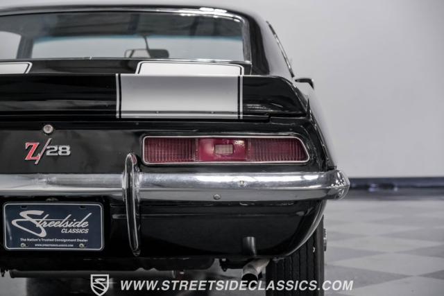 This beautifully restored Z/28 was comprehensively restored to NCRS standards back in the late-1990\'s and it\'s been so well-cared for and loved it\'s still an absolute stunner in person. Finished in Tuxedo Black and White stripes, a huge upgrade over the car\'s original Code 61 Burnished Brown, it\'s the epitome of what people imagine when they think about a 1st generation Z/28. After almost three decades, it\'s starting to show some of its age, with minor imperfections acquired through the years and signs of older prep-work becoming a bit more visible than when the car was fresh, but this car still presents very well despite some of those demerits. It\'s a higher-end, driver-quality ride that looks much younger than the build date would suggest, with a straight body, tight lines, and great gaps providing the background to the deep, shiny finish. Other than the color change, the restorers took no liberties, and everything is pretty much as it was when the car was delivered new, including the egg-crate grille, chin spoiler, bright bumpers with oversized optional bumper guards, and the traditional ducktail spoiler out back. The cowl induction hood is a steel piece that remains functional, feeding the high-winding 302 a steady diet of cool, clean air from the base of the windshield. The white stripes follow the Z/28 correct pattern, narrow at the front and wider at the rear so that they appear parallel when viewed from the front. All the chrome and stainless is polished up, and it wears correct badges in all the right places.