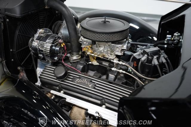 Under the hood, this streetrod boasts a robust 350 V8 crate engine paired with a smooth-shifting 4-speed automatic transmission, recently serviced with a new filter. Performance is enhanced by a Holley carburetor and Edelbrock manifolds with block hugger headers, offering a potent and distinctive soundtrack. The drivetrain is complemented by power steering and power brakes for confident handling, while the Mustang II front suspension with tubular A-arms and coilovers, along with a 4-link rear suspension, deliver a balanced and controlled ride. Four-wheel power disc brakes and 17/18-inch Billet Specialties wheels wrapped in performance tires complete the package.