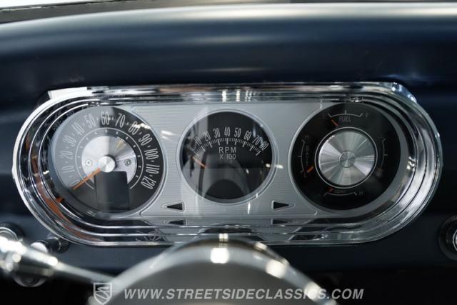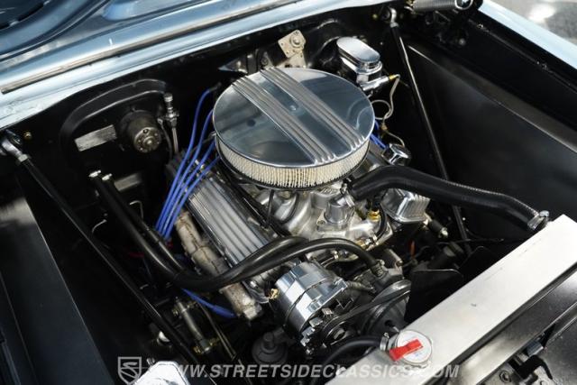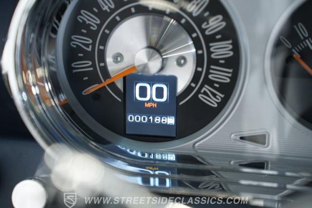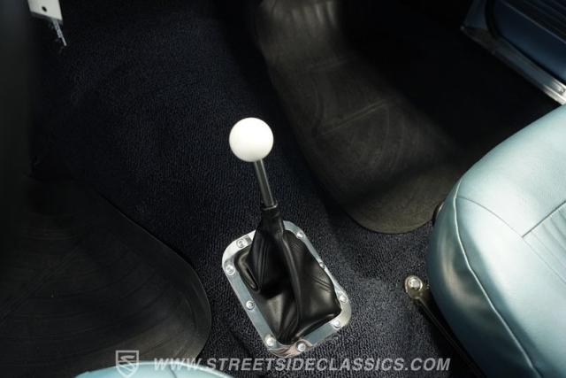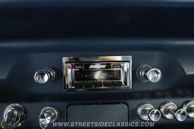 The blue vinyl interior has been kept in largely factory configuration and is in consistently good shape, with a pair of fresh-looking front bucket seats that show only minimal wear and an expanse of unblemished carpeting below. An added tilting chrome steering column with matching levers, along with an aftermarket floor shifter, adds some visual flair, and just beyond it, the dash area is looking strong, with a set of Dakota Digital gauges in the instrument cluster and a Chevrolet-branded, retro-look AM/FM stereo at its center that teams with a trunk-mounted subwoofer and amplifier to provide an outstanding audio experience.