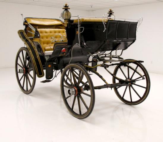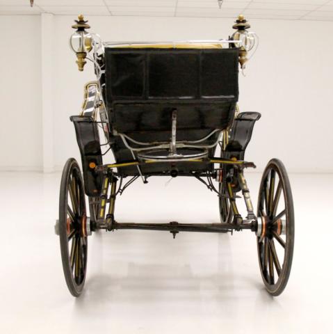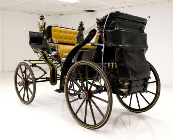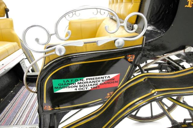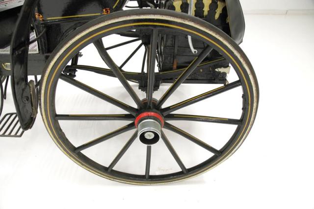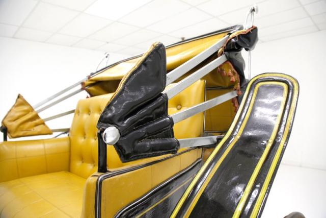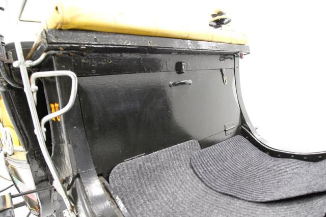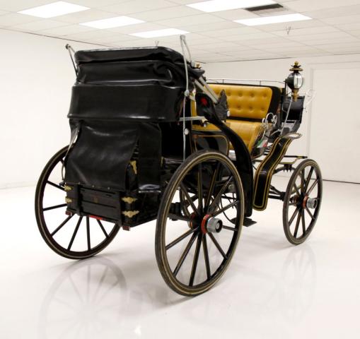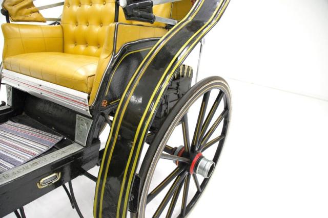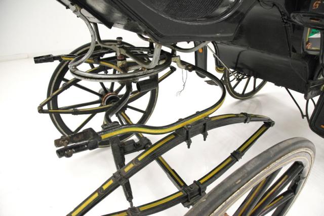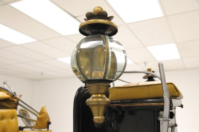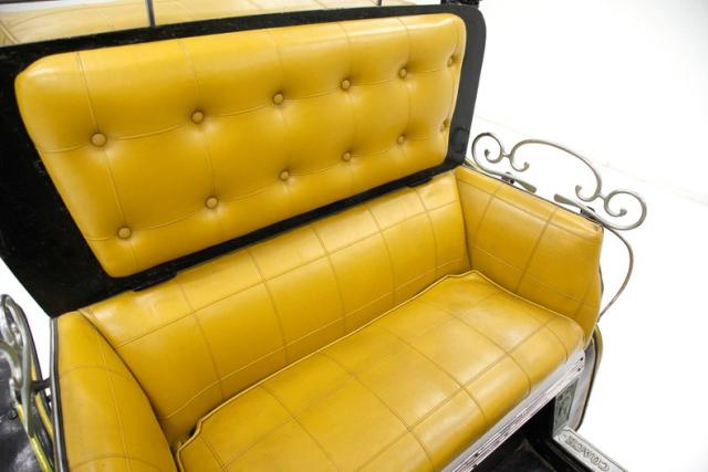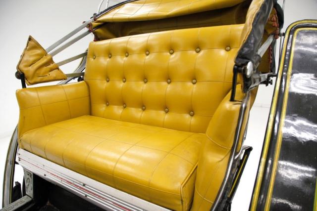 Delicate and elegant, the curvaceous seating for 6 passengers is behind the drivers front seat. These are tufted and buttoned gold leather covered and are amazingly comfortable. Upfront for the driver behind the simple curved wood dash is a single bench seat reserved just for him/her, which is also in gold leather. Under the convertible top are gold broadcloth stitched panels which add plenty of additional light to the interior when the top is in the up position. Some shiny chromed landau bars are noted on the sides and additional filigree handles and guards are mounted to the tops of the seat sides as well as the dash top. Cast iron steps are on either side to aid in your climb to the passenger compartment.