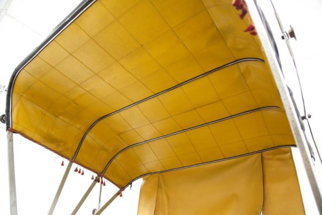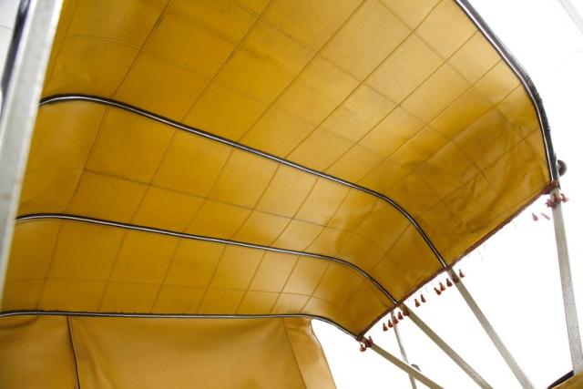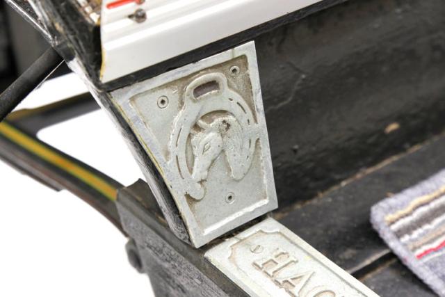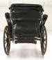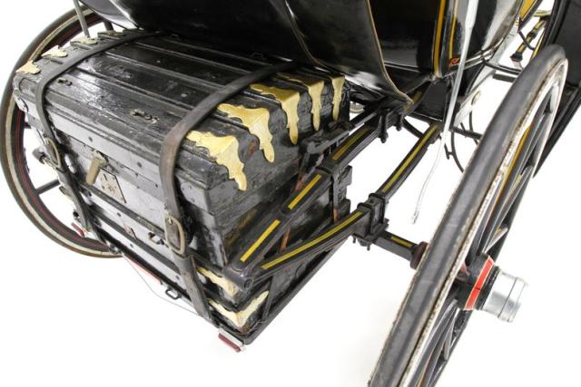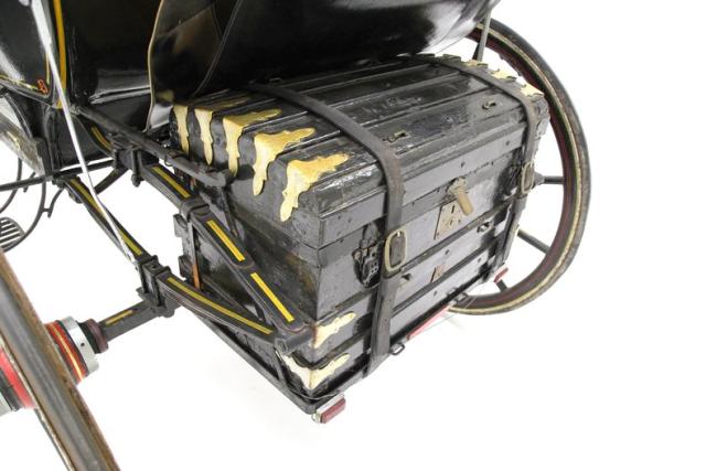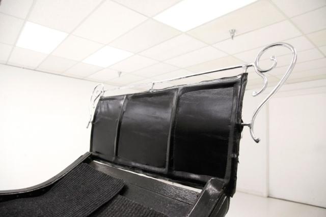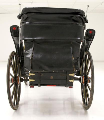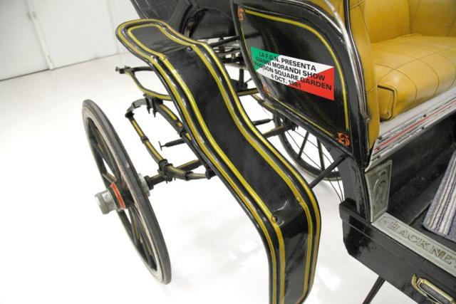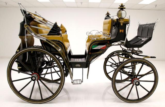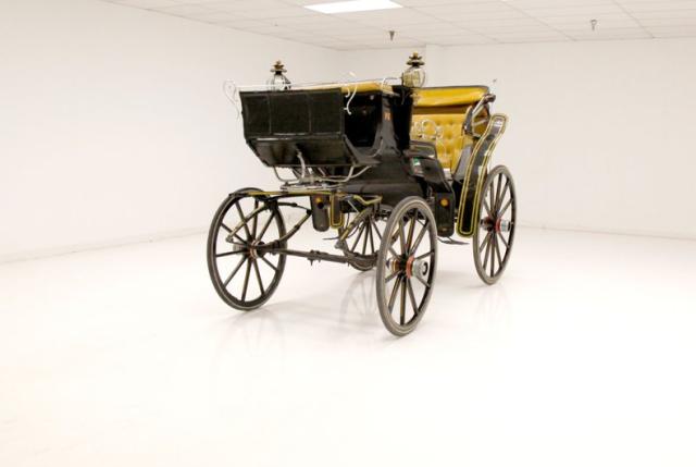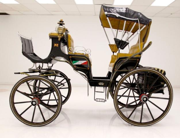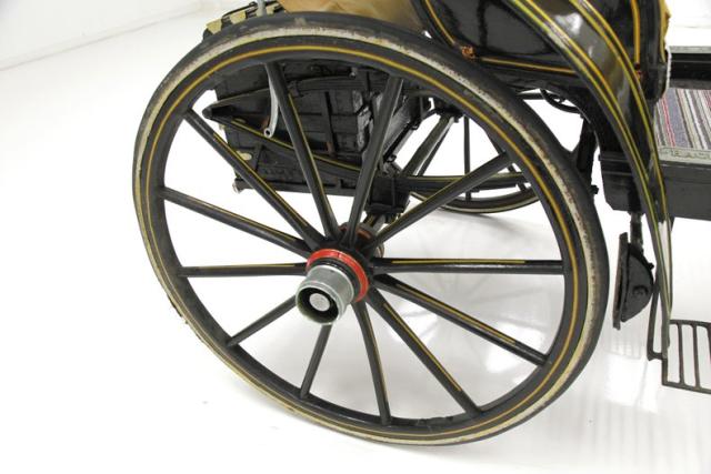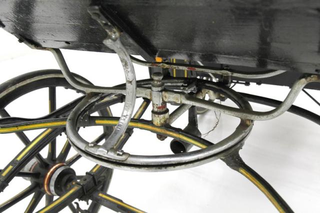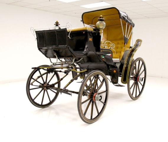 Delicate and elegant, the curvaceous seating for 6 passengers is behind the drivers front seat. These are tufted and buttoned gold leather covered and are amazingly comfortable. Upfront for the driver behind the simple curved wood dash is a single bench seat reserved just for him/her, which is also in gold leather. Under the convertible top are gold broadcloth stitched panels which add plenty of additional light to the interior when the top is in the up position. Some shiny chromed landau bars are noted on the sides and additional filigree handles and guards are mounted to the tops of the seat sides as well as the dash top. Cast iron steps are on either side to aid in your climb to the passenger compartment.