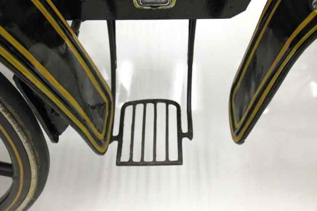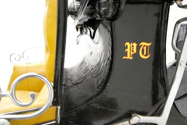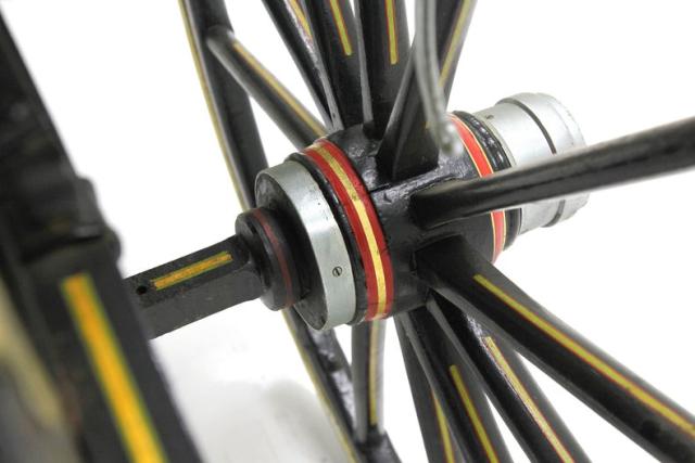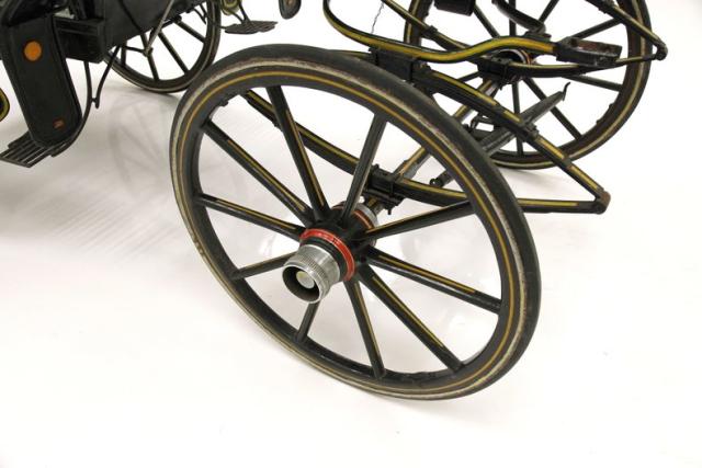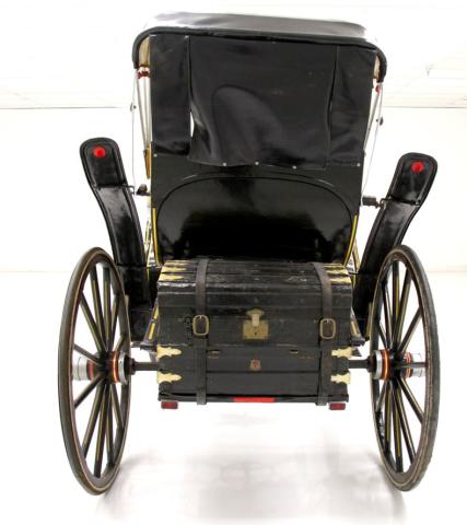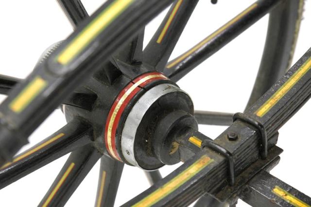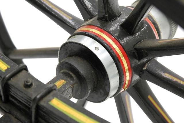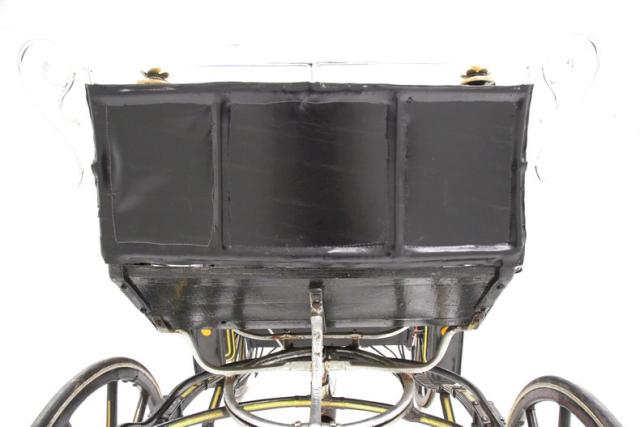 Literally, metal construction with leaf spring suspension and metal hubs for the wood spoked wheels. No rust, nice black paint with gold pinstriping.