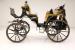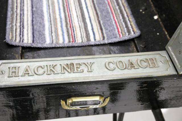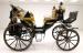 Highly polished and lacquered wood makes up much of the exterior carriage construction. Some formed metal for the fenders, turned wood for the base and steel frame to hold everything together and provide rudimentary suspension. All bathed in highly lacquered and polished black paint with some pinstriping in gold surrounding these panels and highlighting the suspension and undercarriage. A so-called \"Hackney coach\" which translates to a horse drawn carriage for hire that can carry up to 6 passengers that sit behind the front seated carriage driver (This may be where the term \"Hack\" came to be referring to a Taxi driver?). This particular model is looking much like a princess carriage as it has a foldable canvas top with a headliner stitched inside in gold, a rear mounted trunk, and brass pumpkin shaped carriage lamps hanging up front from either side. Large wood spoked and pinstriped wheels have solid rubber tires surrounding them.