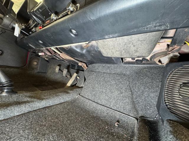 Overall clean underneath with a belly pan taking up a good part of the real estate. We note some previous repairs on the pan, nicely sealed and coated. Dry conditions are found on the engine from which dual exhaust cleanly emit finding their way to a stock style muffler that sends out two exhaust pipes which meet splitters creating four polished tips. Both front and rear suspension are independent with Macpherson struts in back. Disc brakes are supplied to all four wheels.